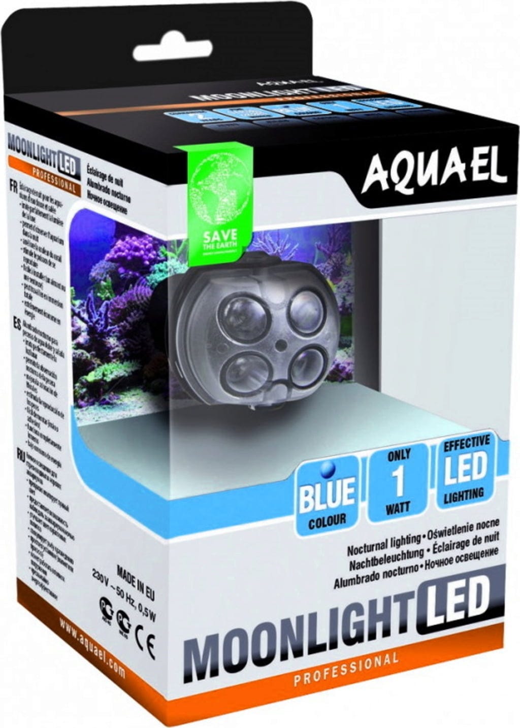 Rasvjeta se može sigurno potopiti u vodu (kako slatku tako i slanu vodu), jer je u skladu s IPX8 standardom za vodootpornost i tako je potpuno zaštićena od vode. Tehnologija od 5 V u kojoj se uređaj proizvodi jamči apsolutnu sigurnost kako za životinje koje žive u akvariju tako i za njihove vlasnike. Snažno plavo svjetlo uređaja MOONLIGHT LED savršeno osvjetljava unutrašnjost akvarija, imitirajući prirodnu mjesečinu. Osigurava savršene uvjete za hranjenje noćnih životinja. Također je eksperimentalno dokazano da upotreba ovakve vrste rasvjete može potaknuti reprodukciju takozvanih „problematičnih“ vrsta riba.