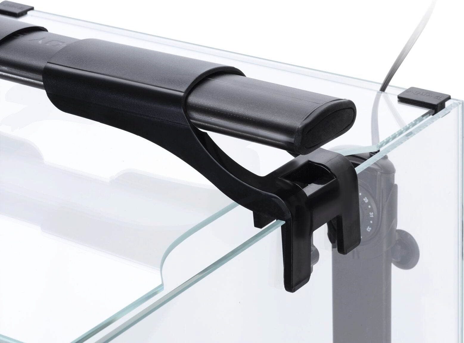 ► akvarij sa zaobljenim uglovima i poklopcem od opti-stakla, koji nema uobičajene silikonske fuge koje bi mogle spriječiti transparentnost akvarija;