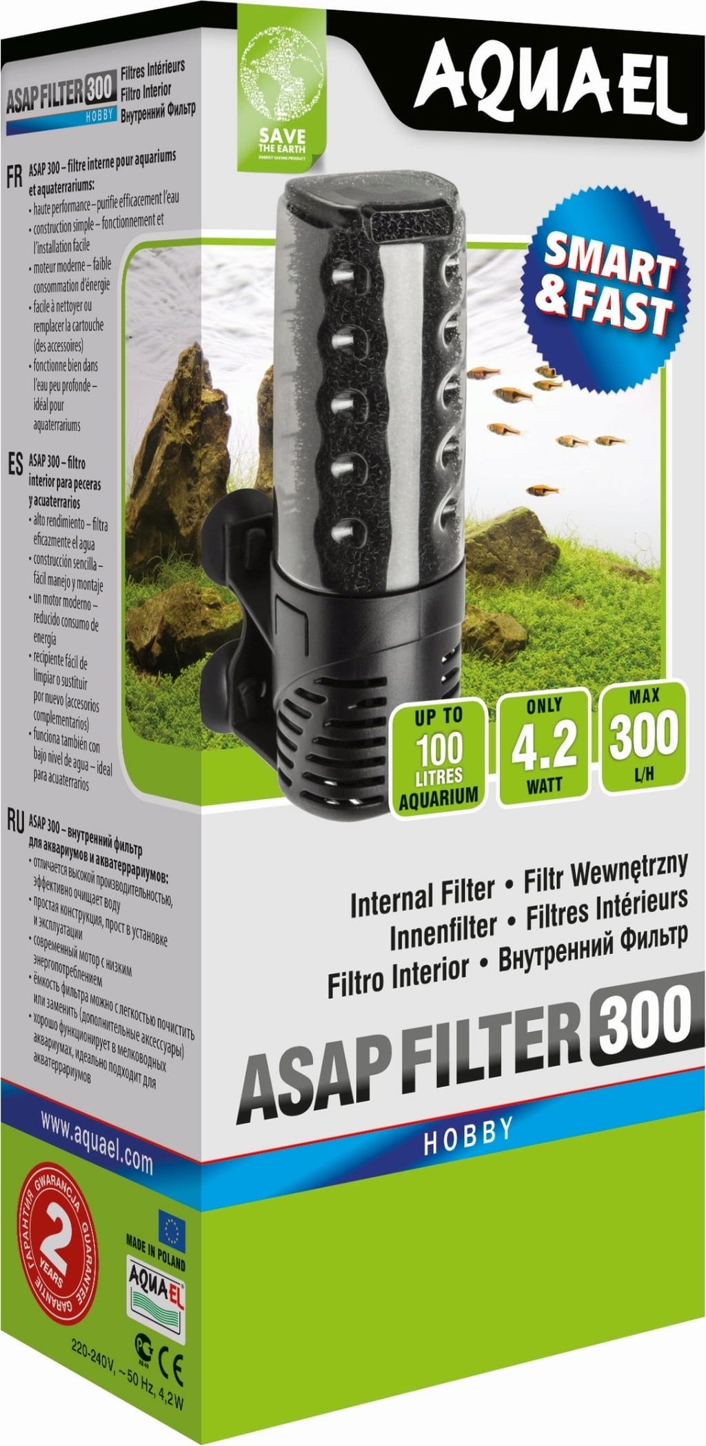 Unutarnji filter ASAP sastoji se od modernog, energetski učinkovitog motora smještenog u elegantno kućište i velike prozirne filtarske posude napunjene pažljivo odabranom filterskom spužvom. Spužvu brzo nastane korisne bakterije, pa je voda koja prolazi kroz filter podvrgnuta i biološkoj i mehaničkoj filtraciji. Tako ostaje bistra i sigurna za stanovnike akvarija. Filter zahtijeva dvije osnovne vrste postupaka održavanja. Jedna se sastoji u uklanjanju filtarske posude i zamjeni novom (nudimo standardne uloške kao i uloške s aktivnim ugljenom ili apsorberima fosfata kako bi se spriječio rast algi). Druga uključuje ispiranje filtarske spužve u vodi ispuštenoj iz akvarija. Ovaj se postupak može izvesti bez uklanjanja cijelog filtera iz akvarijske posude, što je vrlo praktično i značajno smanjuje vrijeme održavanja.