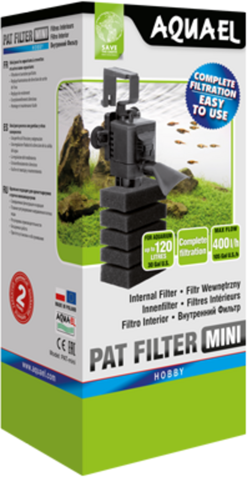 AQUAEL PAT MINI minijaturni je turbinski filter namijenjen malim slatkovodnim akvarijima. Ovaj se uređaj sastoji od sićušne glave i pažljivo odabrane filterske spužve. Zahvaljujući korištenju inovativnih dizajnerskih rješenja, glava ima maksimalni kapacitet do 400 l/h, što odgovara tipičnom turbinskom akvarijskom filteru srednje veličine. I sve to uz potrošnju energije od najviše 4 W.