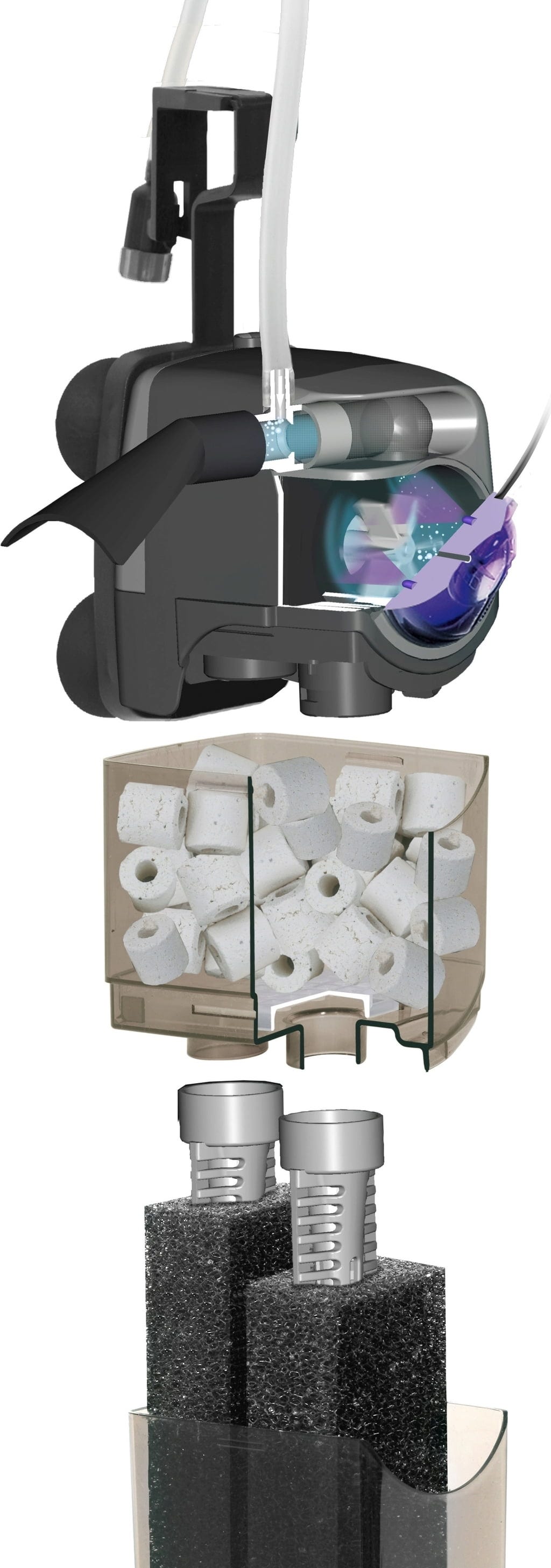 Posebno dizajnirana komora za filterske medije sprječava da voda procuri natrag tijekom izmjene vode ili kada se filter ukloni iz akvarija, npr. radi promjene vode ili ispiranja spužve. Kako bi se olakšalo održavanje UNIFILTER UV-a, nudimo dva odvojena spužvasta uloška koja se mogu naizmjence vaditi i čistiti. Na taj način zaštićene su kolonije nitrifikacijskih bakterija, važne za procese pretvorbe dušika. Kako bi se osigurala neprekinuta filtracija, preporučuje se izmjenično i neovisno čistiti spužvaste filter uloške.