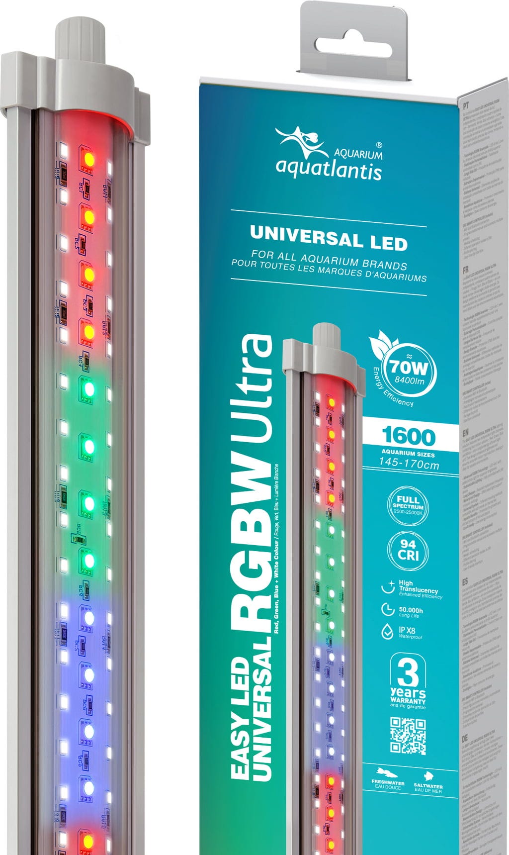 EasyLED Universal RGBW Ultra dostupan je u raznim veličinama i kompatibilan je sa svim uobičajenim markama akvarija zahvaljujući svojim svestranim mogućnostima montaže. Instalacija je nevjerojatno jednostavna: jednostavno zamijenite svoje stare T5 ili T8 žarulje ovim modernim LED sustavom i odmah uživajte u poboljšanoj kvaliteti svjetla uz smanjenje potrošnje energije.