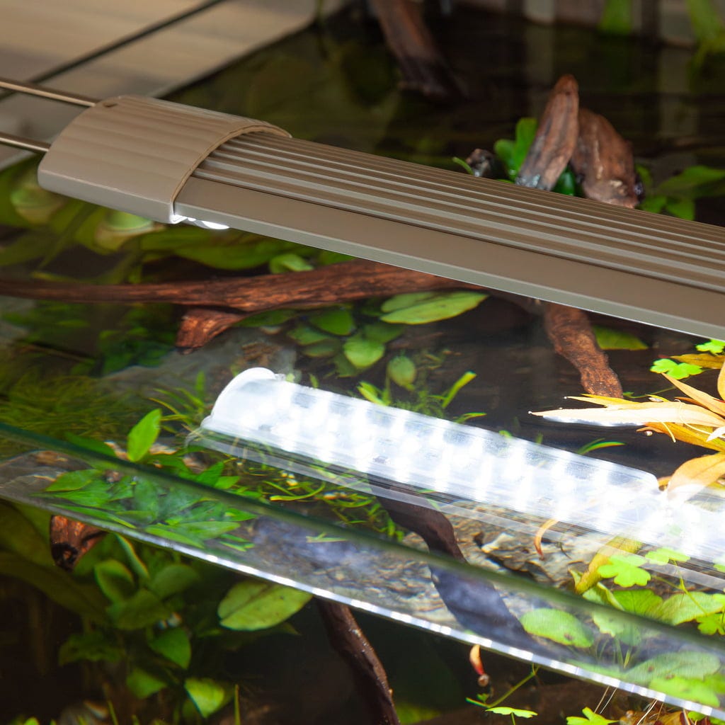 Sofisticirana aluminijska konstrukcija s integriranim rashladnim rebrima osigurava optimalno odvođenje topline i posebno je dizajnirana za zahtjevne uvjete u akvarijima. Prozirno akrilno staklo povećava prijenos svjetlosti i time poboljšava učinkovitost osvjetljenja. Zahvaljujući podesivim metalnim nosačima na oba kraja, LED svjetlo se može fleksibilno prilagoditi svakom akvariju.