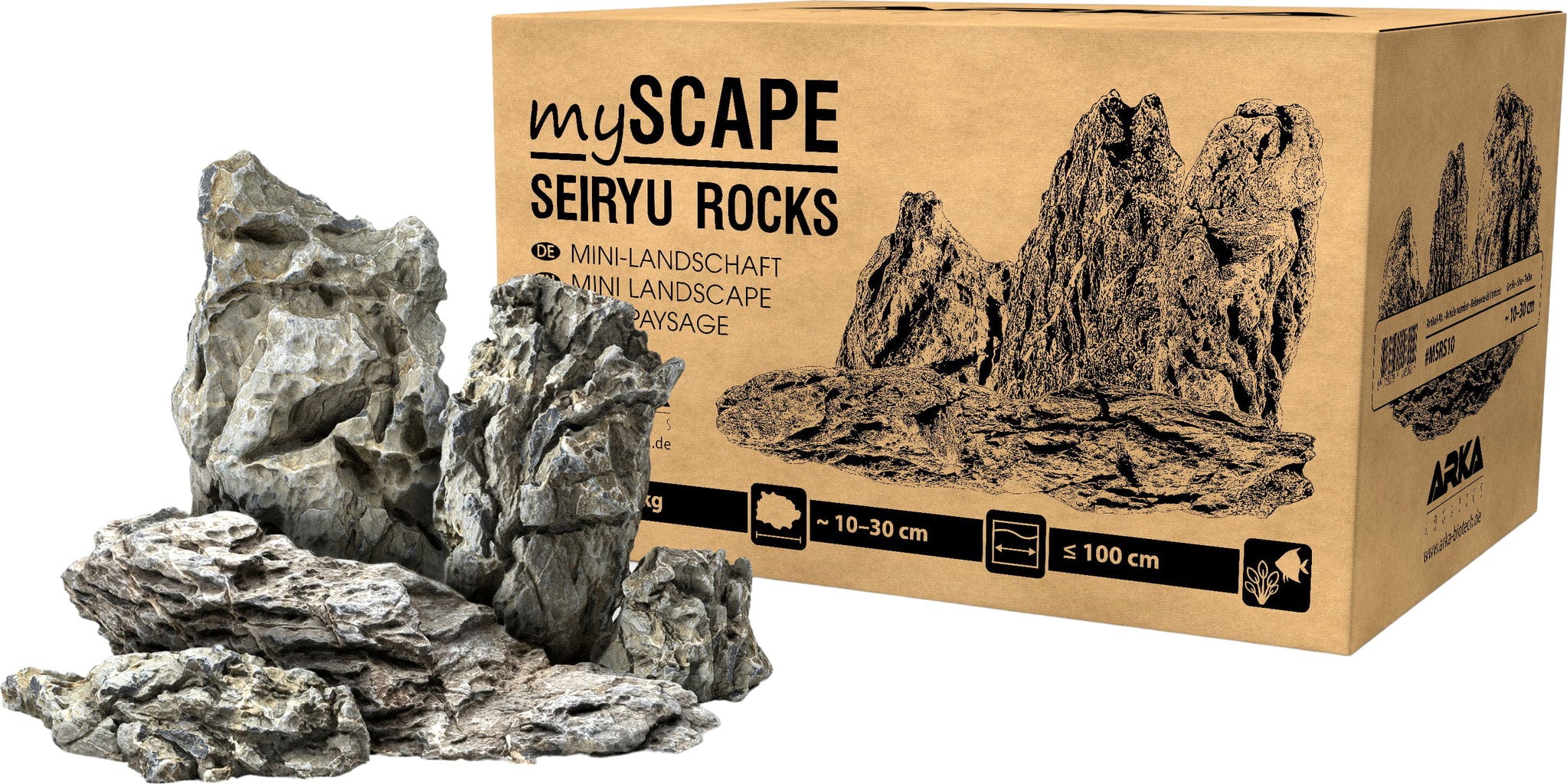 ARKA Aquatics myScape Rocks Seiryu je prirodna stijena koja je savršena za spektakularne i jedinstvene vodene pejzaže, kao što su: B. Iwagumis, u svakom slatkovodnom akvariju kao i strukture u svakom terariju. ARKA Aquatics myScape-Rocks Seiryu idealne su za sadnju zahvaljujući svojoj nepravilnoj površini i mogu se koristiti odmah nakon kratkog pranja. ARKA Aquatics myScape-Rocks Seiryu može malo očvrsnuti vodu, ali to je bezopasno čak i za škampe ako se voda redovito mijenja.