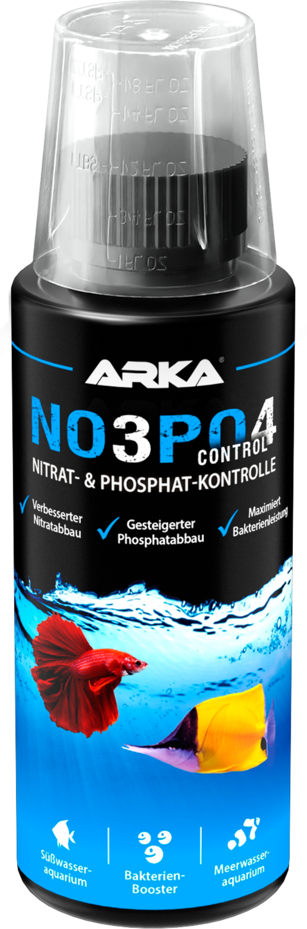 ARKA NOPO Control je posebno razvijena tekućina od odabranih ugljikohidrata. Oni osiguravaju sigurnu i optimalnu biološku razgradnju nitrata (NO3) i fosfata (PO4) u svakom morskom i slatkovodnom akvariju. ARKA NOPO Control maksimizira učinkovitost bakterija prisutnih u akvariju, čime se omogućuje učinkovita razgradnja nitrata i fosfata čak i pri visokim vrijednostima hranjivih tvari.