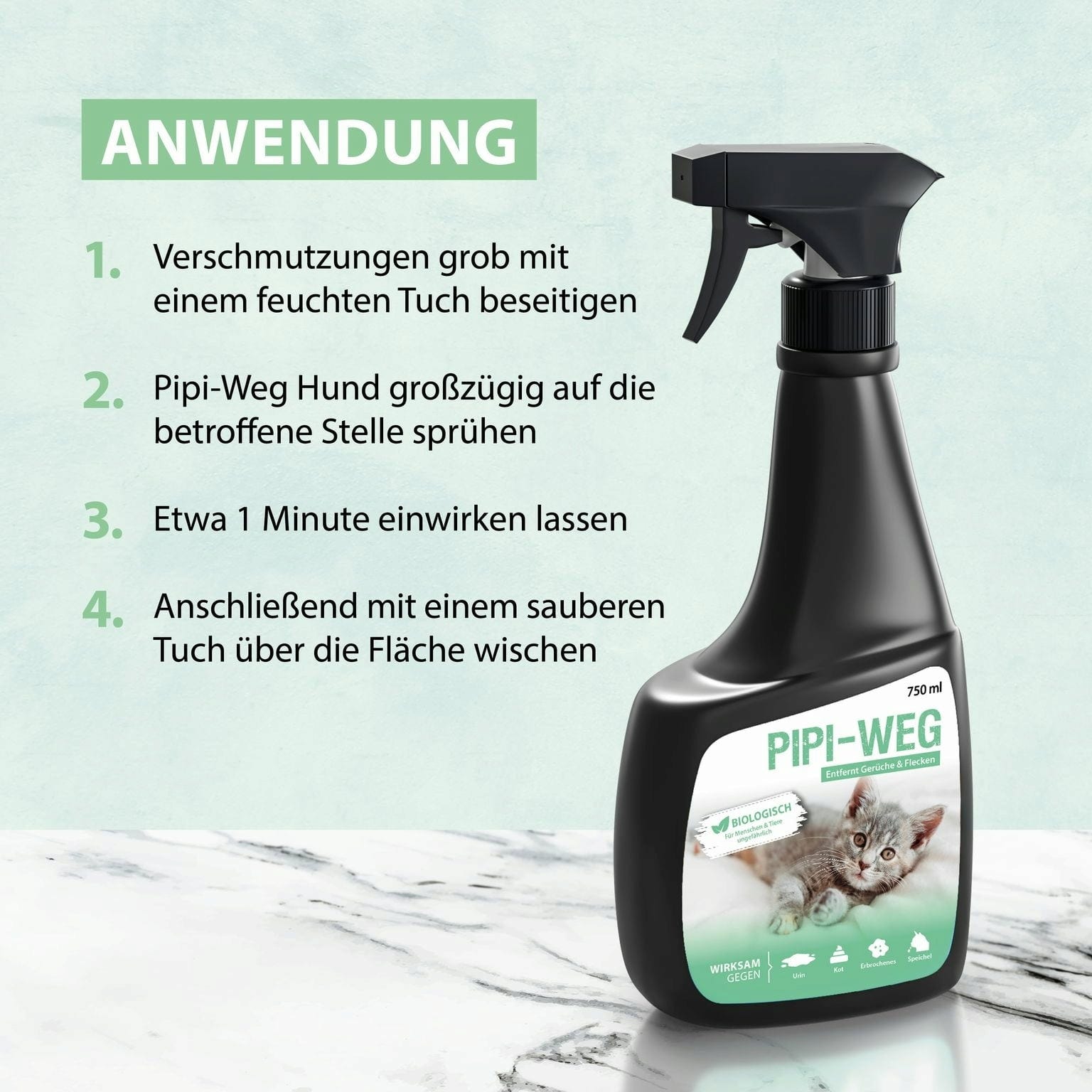 Primjena: Prvo uklonite grubu prljavštinu (izmet, kosu, povraćotinu itd.) vlažnom krpom. Zatim obilno poprskajte Pipi-Weg po području i ostavite da djeluje najmanje 1 minutu. Nakon toga obrišite površinu čistom krpom. Za jako tvrdokorne mrlje (npr. već osušene mrlje) ostavite proizvod da djeluje 24 sata. Pažnja: Područje treba uvijek održavati vlažnim kontinuiranim prskanjem tijekom cijelog vremena izlaganja! Nakon cijelog postupka obrišite čistom krpom!