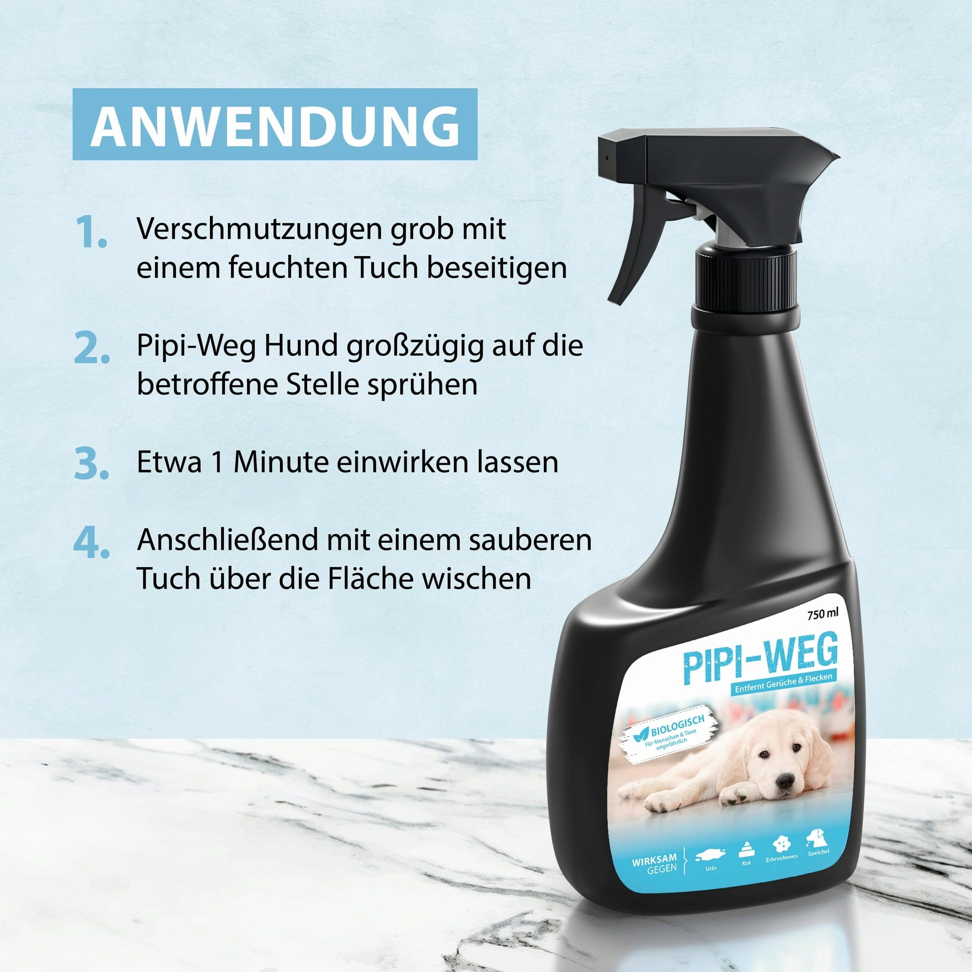 Mladi pas, bolesni pratilac - kako se brzo može dogoditi nesreća! S učinkovitim sredstvom za čišćenje ARKA možete lako i trajno ukloniti mrlje od izmeta, urina, povraćanja ili sline. Neugodni mirisi također odmah nestaju. Može se koristiti na gotovo svim površinskim strukturama: bilo da se radi o glatkim (vodootpornim) podovima ili čupavim tepisima, plastici ili tapeciranom namještaju - Pipi-Weg je visoko učinkovit biološki proizvod i, kada se pravilno koristi, bezopasan je za ljude i životinje!