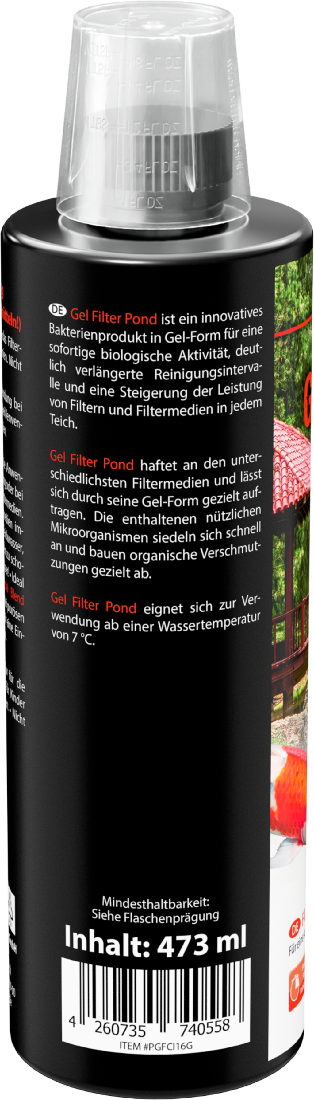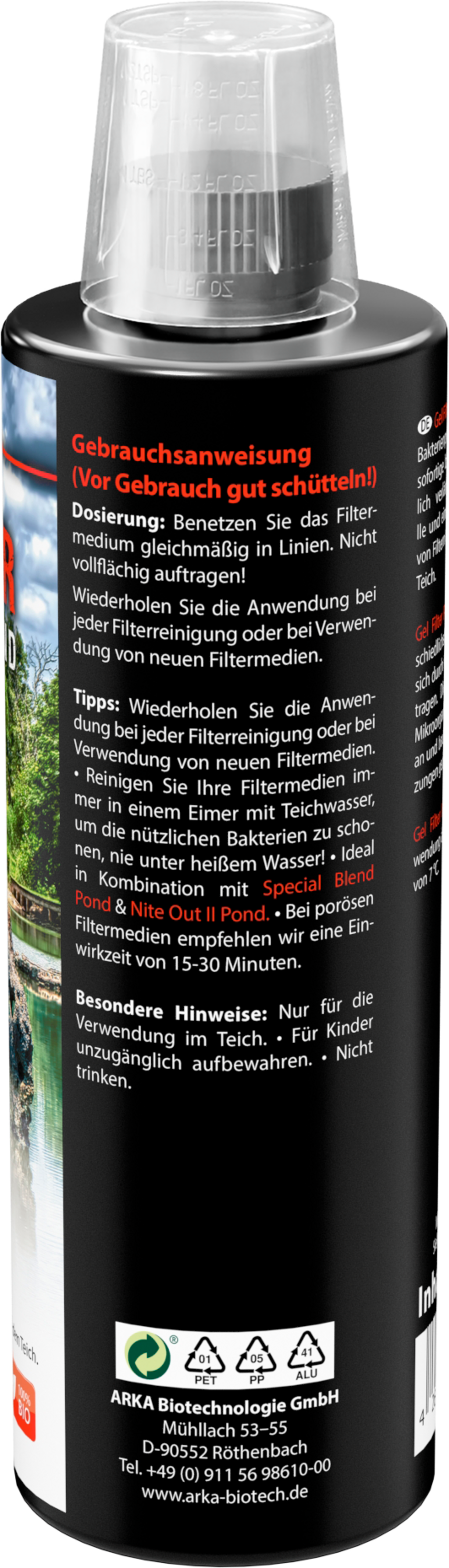 Zahvaljujući svom obliku gela, Gel Filter Pond prianja na različite medije za filtriranje i može se nanositi ciljano. Korisni mikroorganizmi sadržani u njemu brzo se talože i specifično razgrađuju organsku kontaminaciju.
