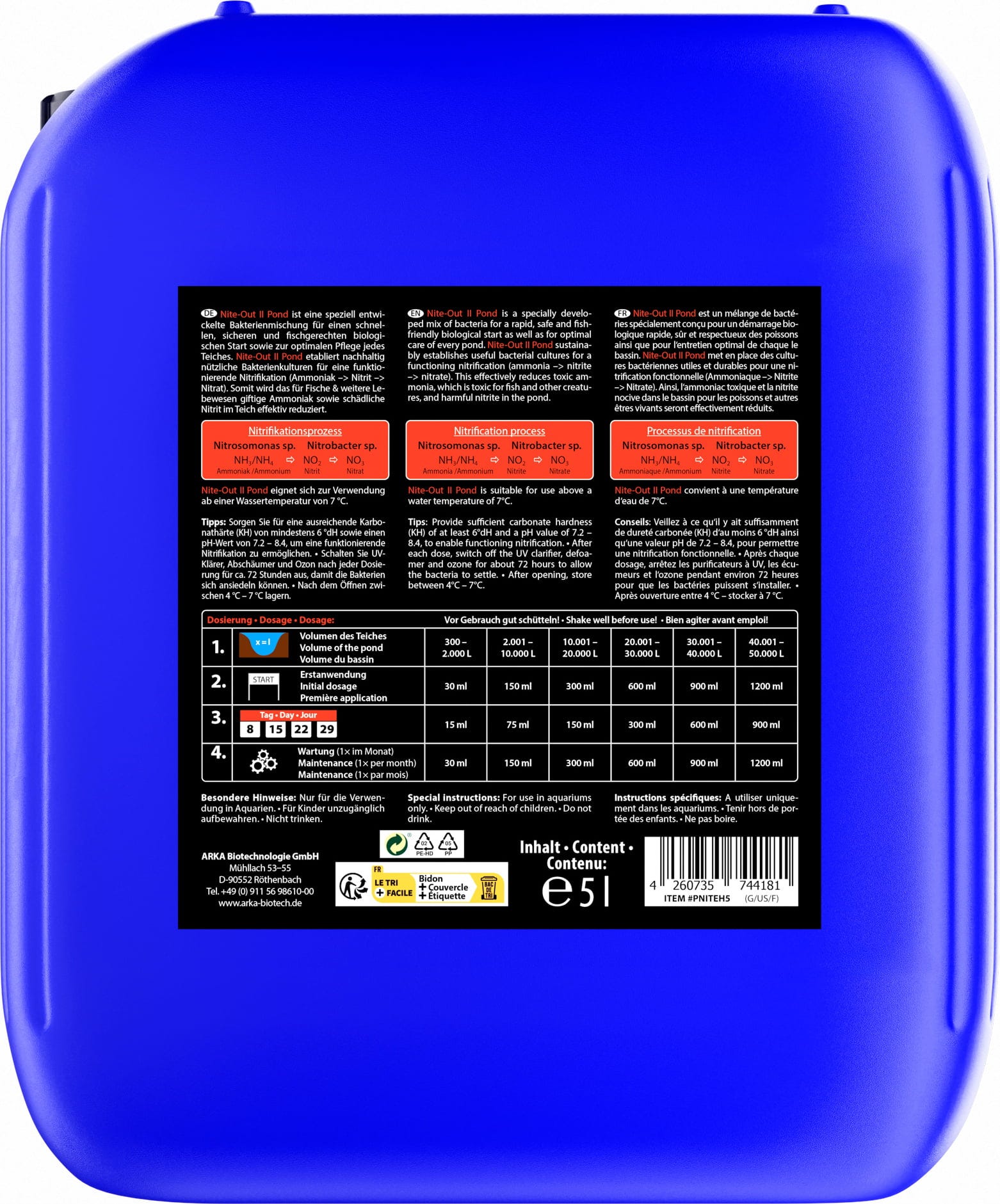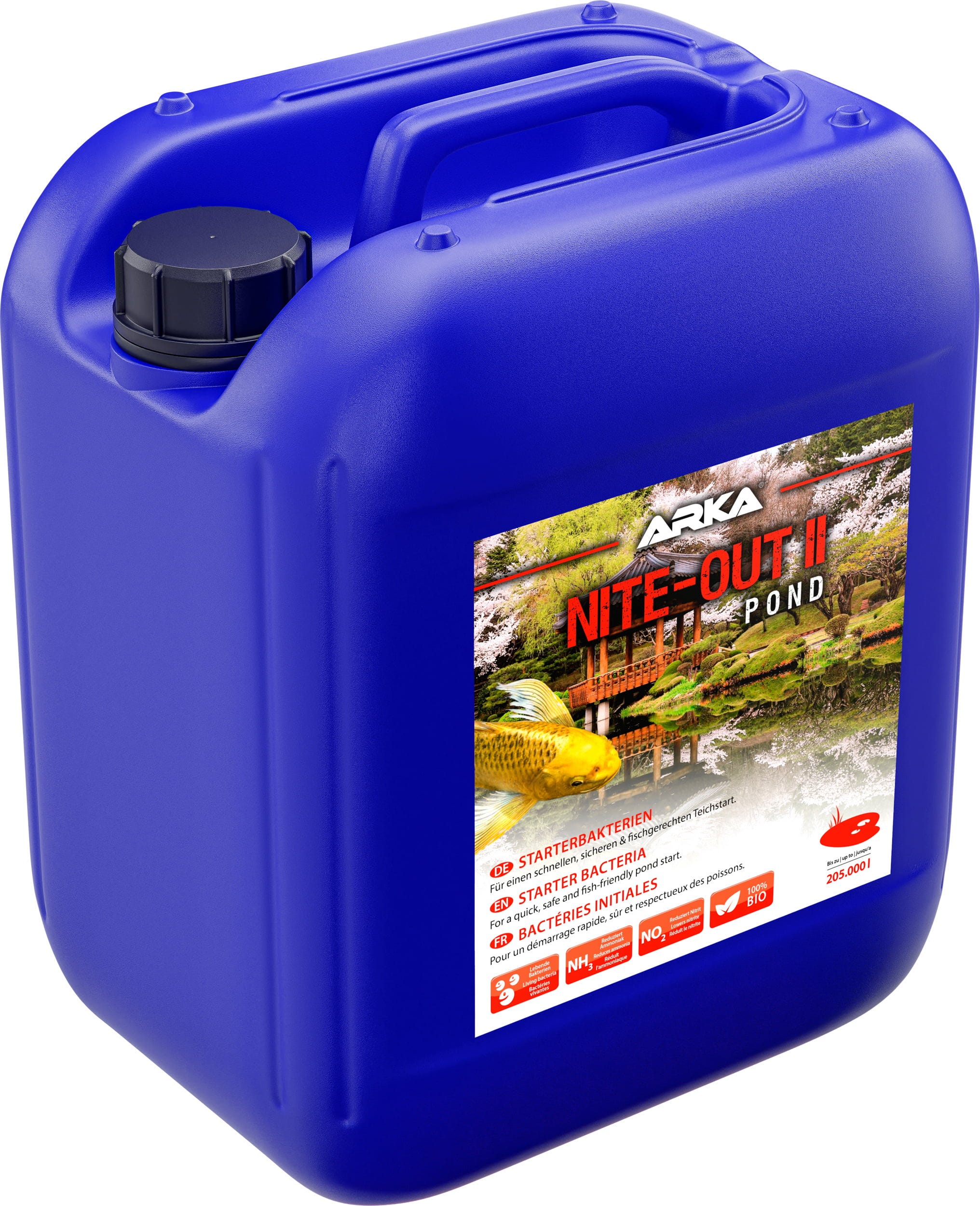 Nite-Out II Pond pruža biološki prihvatljiv početak za ribe i osigurava optimalnu njegu vode u ribnjaku. Posebno razvijena bakterijska mješavina smanjuje štetni amonijak i nitrite putem nitrifikacije. Pripravak je učinkovit već na temperaturi vode od 7 °C. Da bi nitrifikacija učinkovito djelovala, KH mora biti najmanje 6, a pH mora biti stabilan između 7,2 i 8,4.
