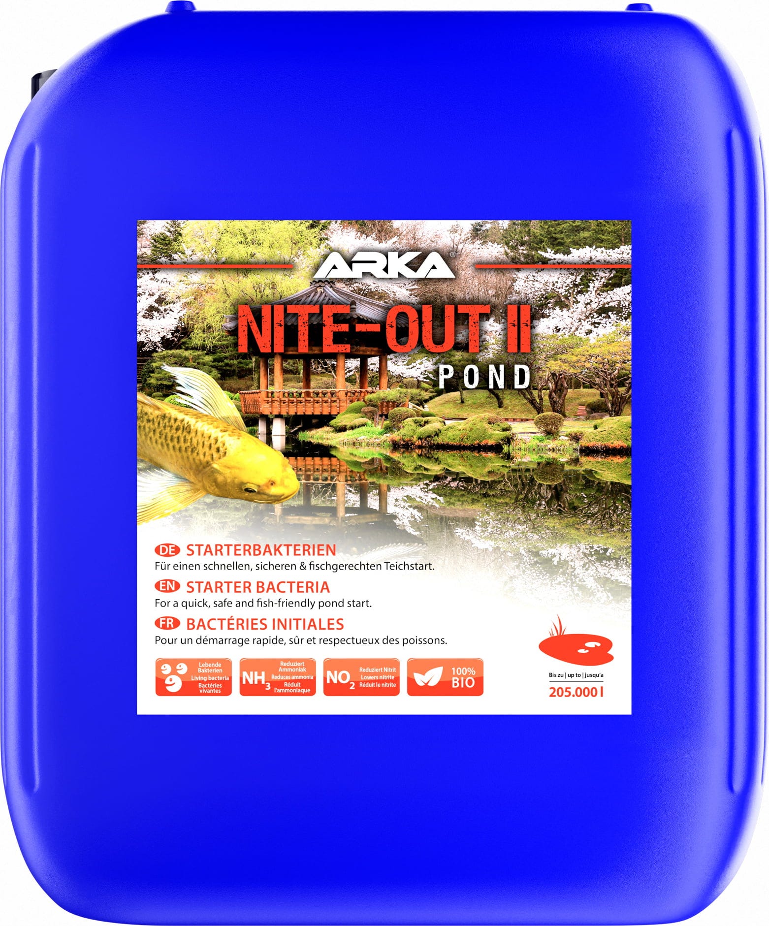 Nite-Out II Pond pruža biološki prihvatljiv početak za ribe i osigurava optimalnu njegu vode u ribnjaku. Posebno razvijena bakterijska mješavina smanjuje štetni amonijak i nitrite putem nitrifikacije. Pripravak je učinkovit već na temperaturi vode od 7 °C. Da bi nitrifikacija učinkovito djelovala, KH mora biti najmanje 6, a pH mora biti stabilan između 7,2 i 8,4.