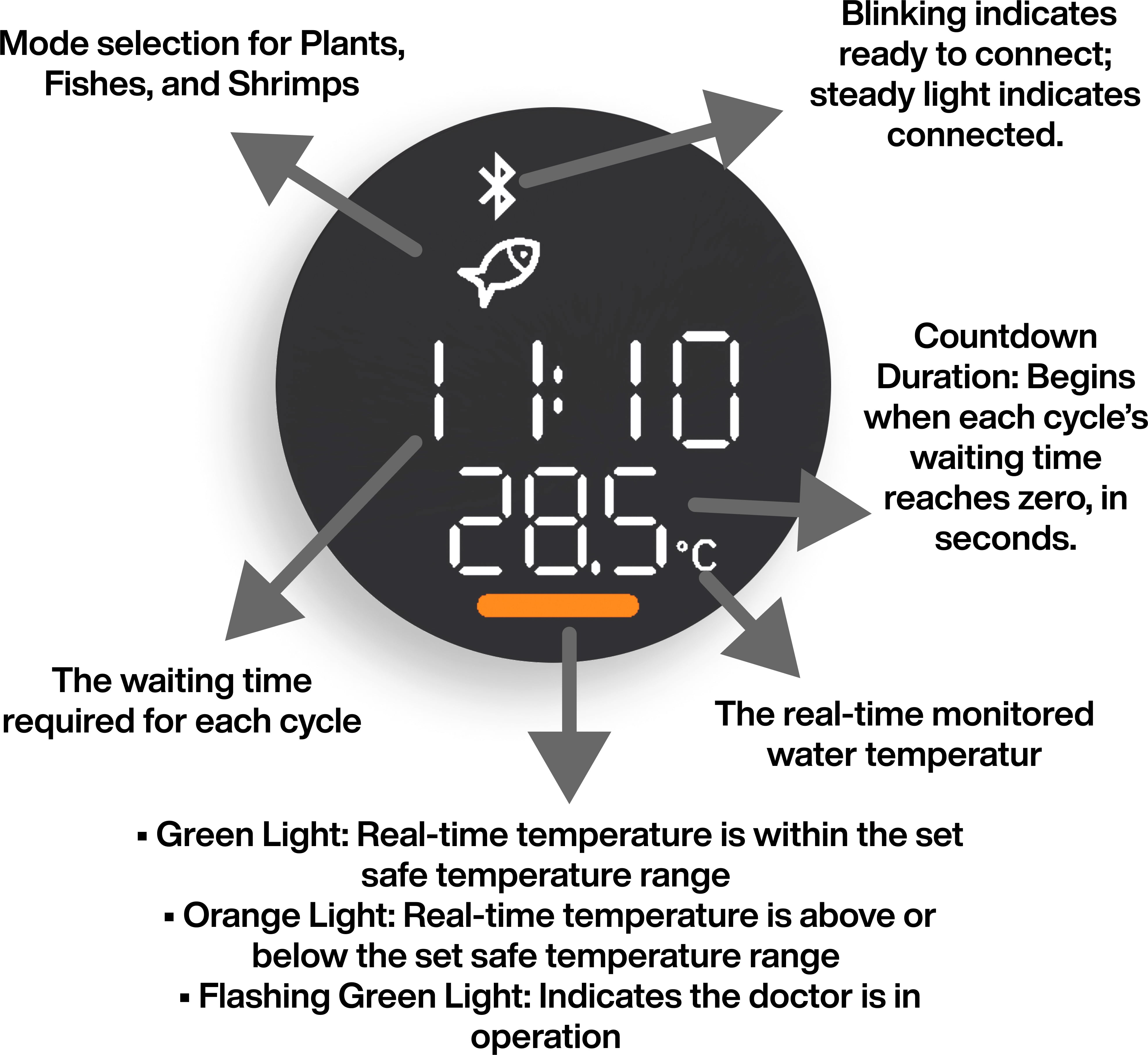 Pomoću integriranog senzora stalno pratite temperaturu u svom akvariju. U stvarnom vremenu se možete uvjeriti da je sve u redu putem intuitivnog sustava boja. Zeleno, narančasto i zeleno treperavo svjetlo pokazuju vam kakva je temperatura u vašem akvariju - tako uvijek imate uvid u optimalnu temperaturu vode!