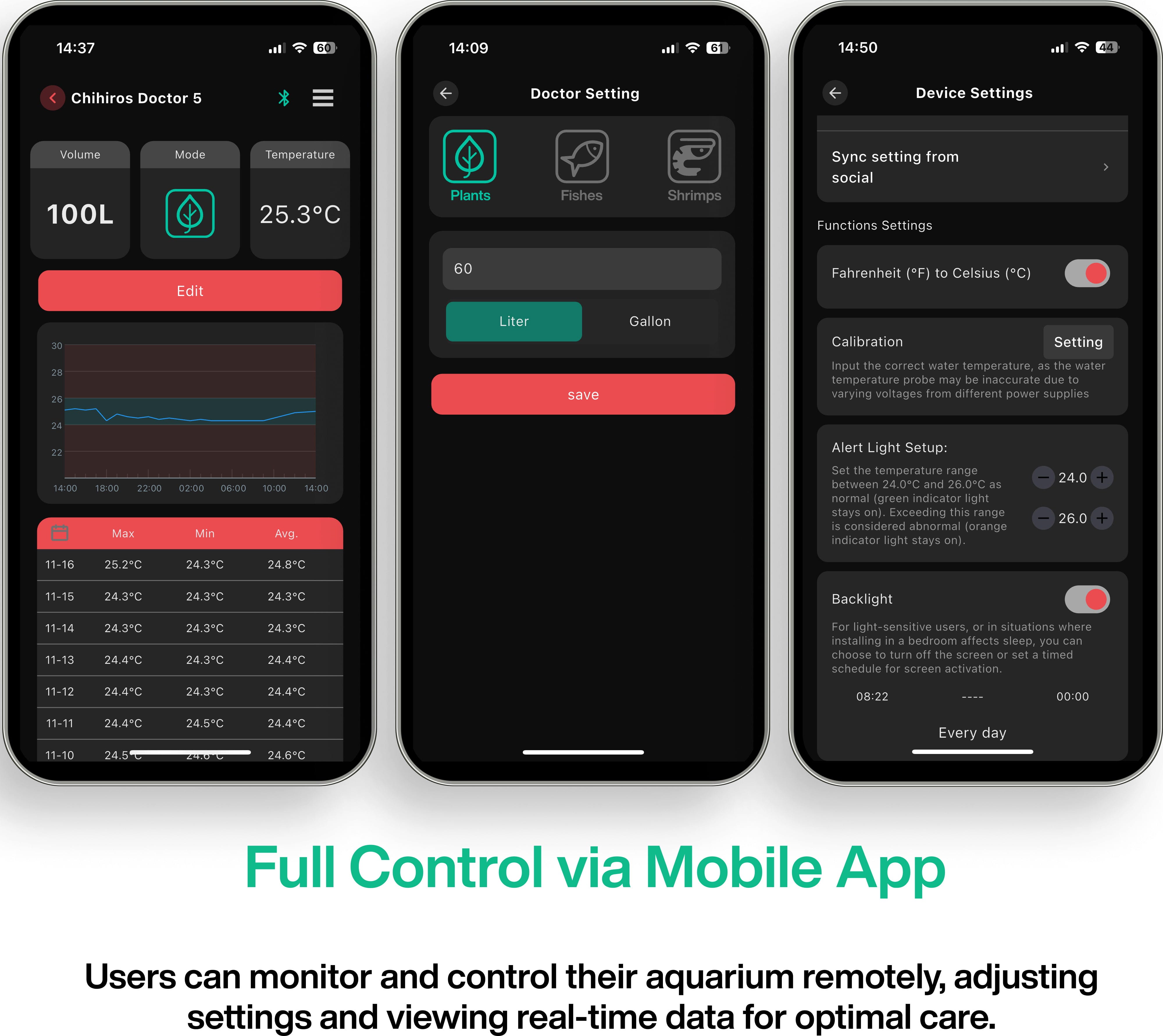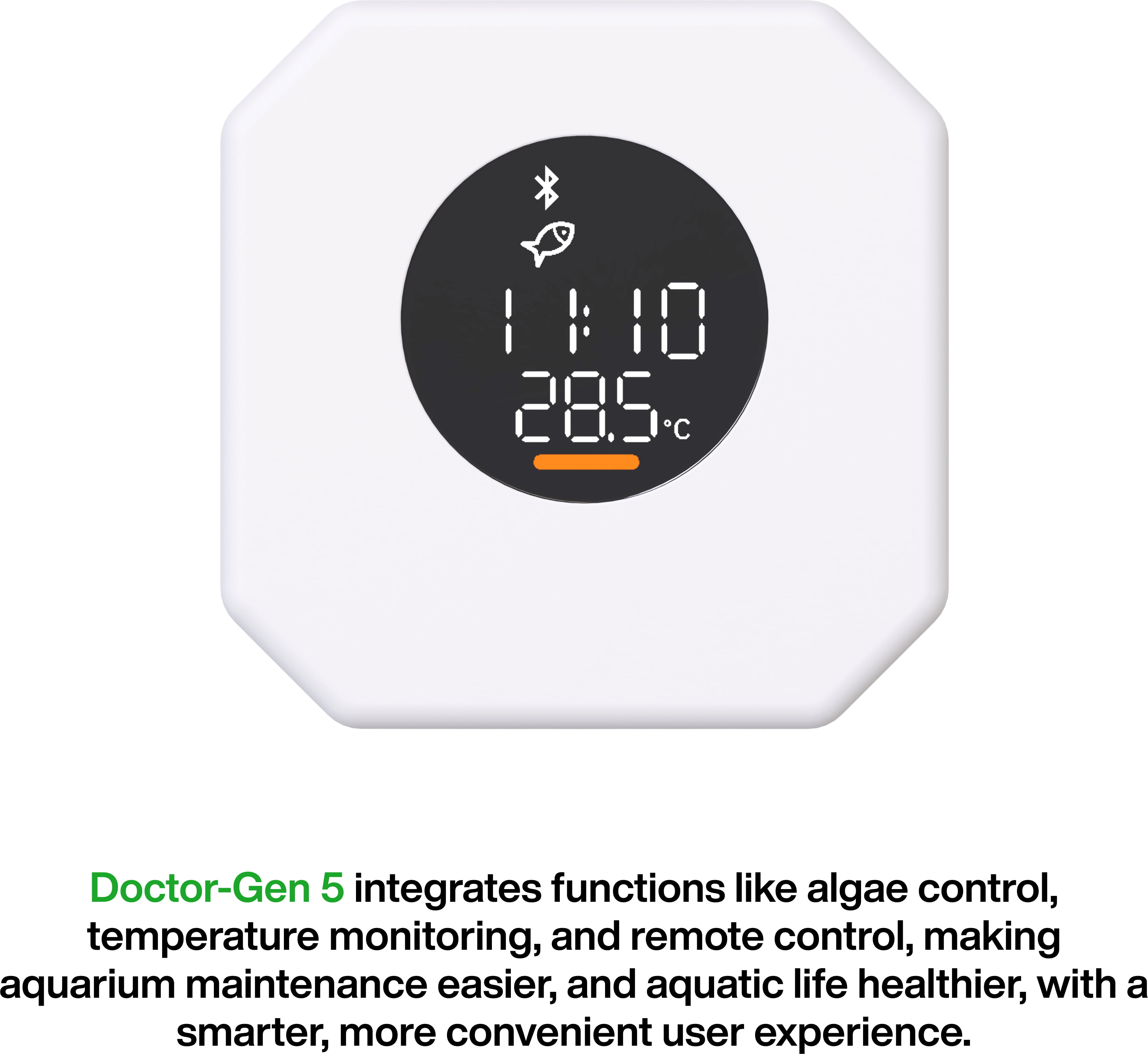 Doctor 5 se može vrlo praktično kontrolirati putem aplikacije, tako da uvijek imate pristup svim funkcijama i postavkama te primate podatke u stvarnom vremenu i upozorenja izravno na svoj pametni telefon. Instalacija je nevjerojatno jednostavna zahvaljujući magnetskom priključku i vodootpornom ulošku koji se lako mijenja. Pružite svom akvariju inteligentnu njegu koju zaslužuje!