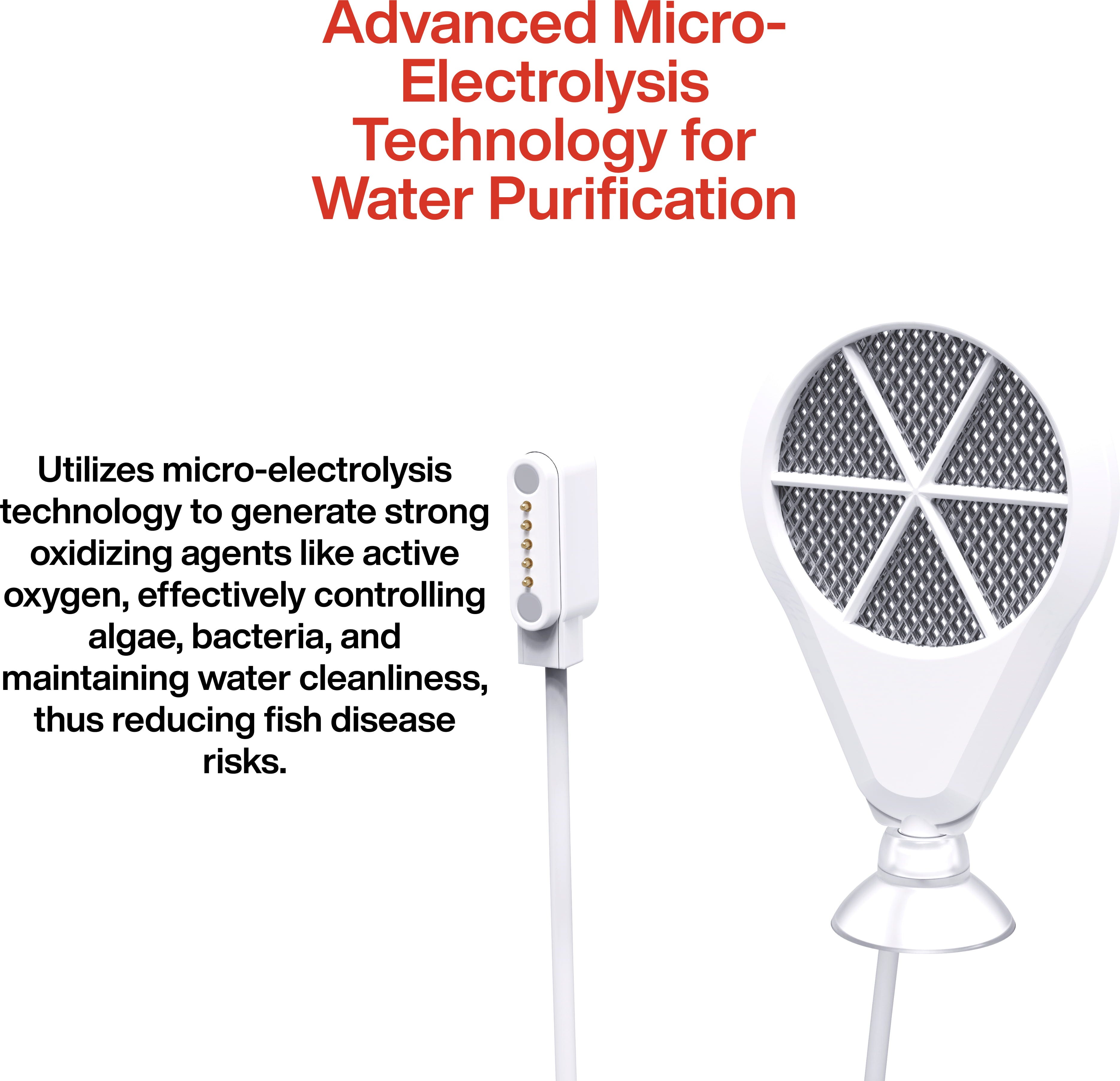 No, srž sustava je napredna tehnologija mikro-elektrolize: ona stvara čak 5 aktivnih oksidacijskih sredstava koja mogu biti izvrsna podrška protiv algi, bakterija i štetnih tvari! Rezultat je kristalno čista voda vrhunske kvalitete u kojoj će se stanovnici akvarija zasigurno osjećati ugodno.