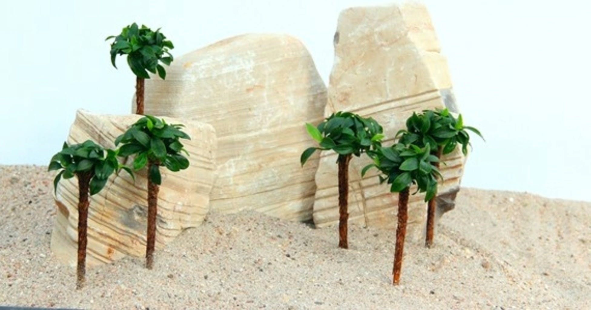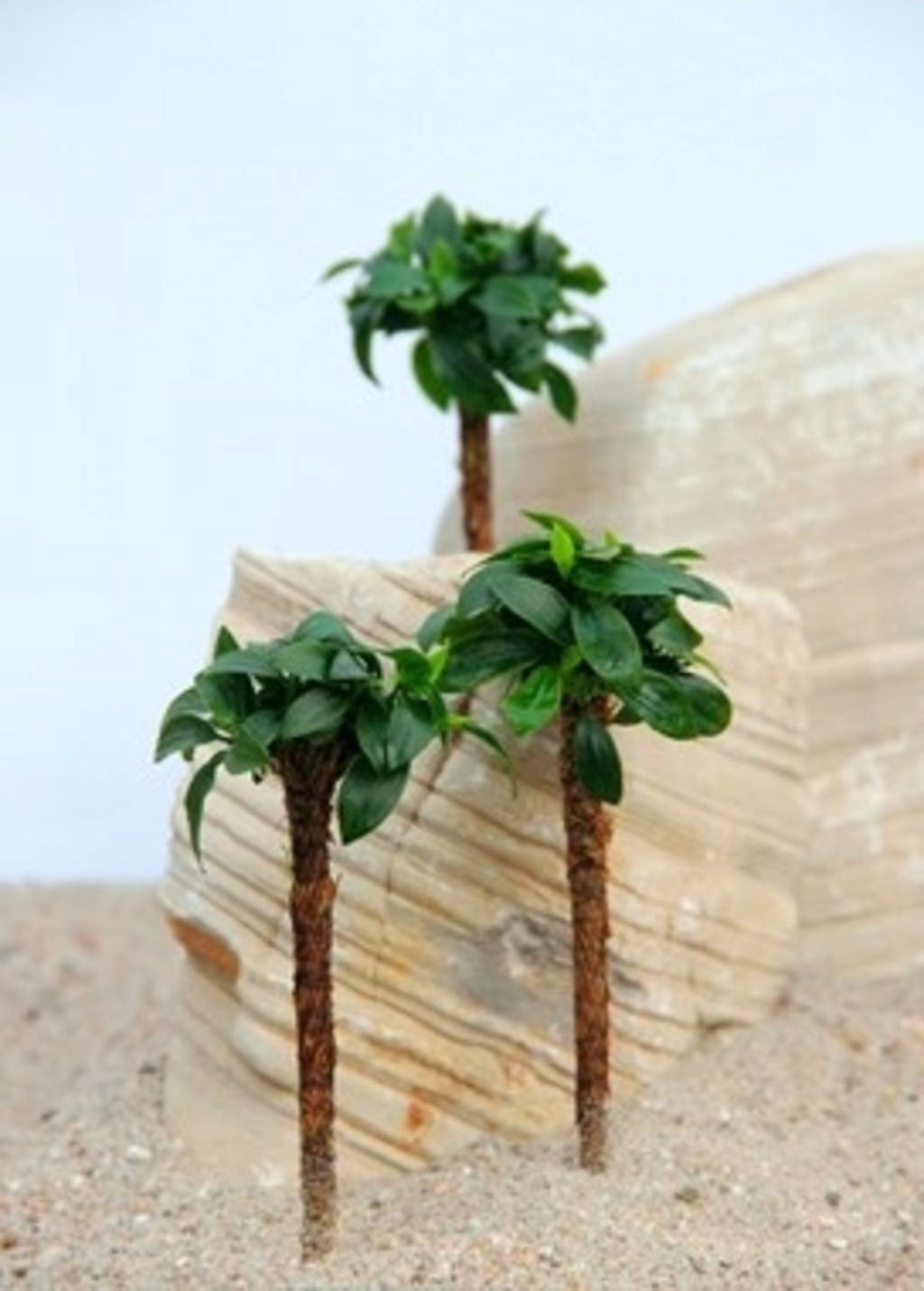 Za ovu elegantnu kreaciju izrađena je simpatična minijaturna palma od Anubias bart. var. nana Bonsai, bambusa i palminih vlakana! Zahvaljujući maloj veličini predstavlja savršen dekorativni element za manje akvarije, a koristi se i u aquascapingu.