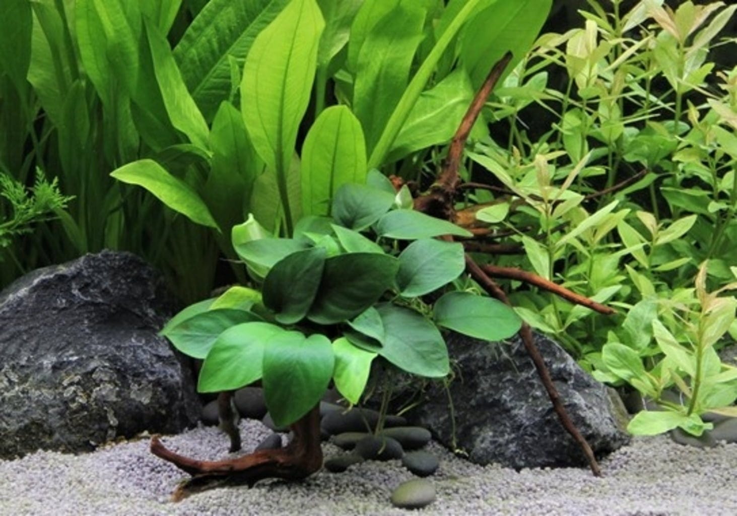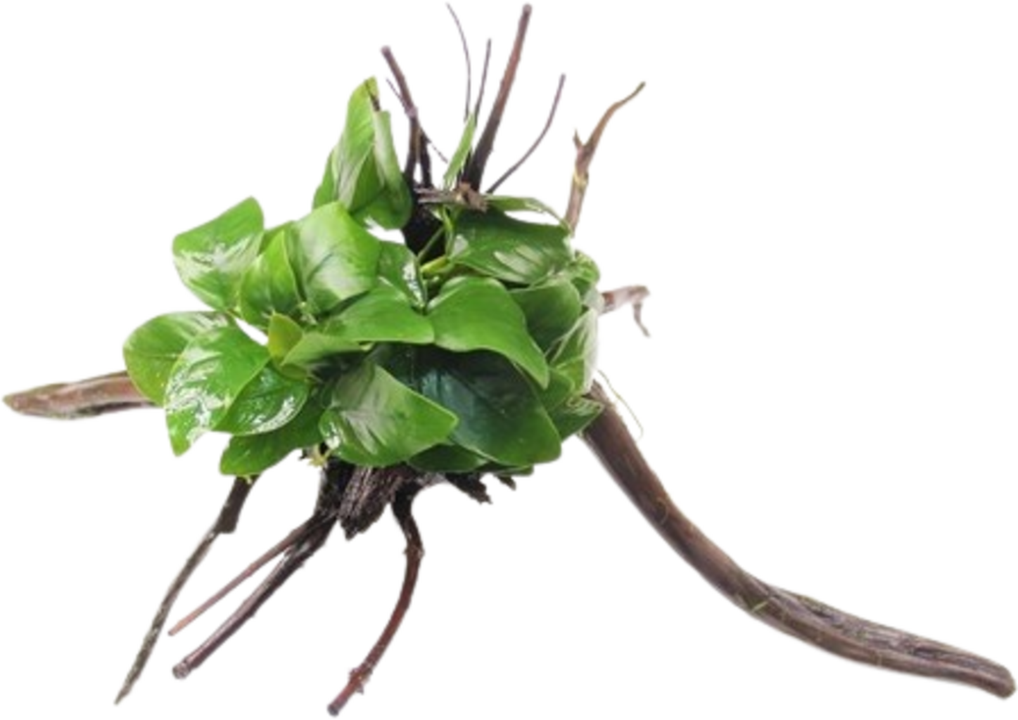 U ovoj elegantnoj kombinaciji Spiderwood je obrastao biljkom Anubias barteri var. nana. Ova biljka uklapa se u svako područje akvarija i uz to je vrlo jednostavna za njegu. Njeni listovi imaju intenzivnu zelenu boju, biljka raste prilično sporo i može doseći visinu od 5 do 10 cm.