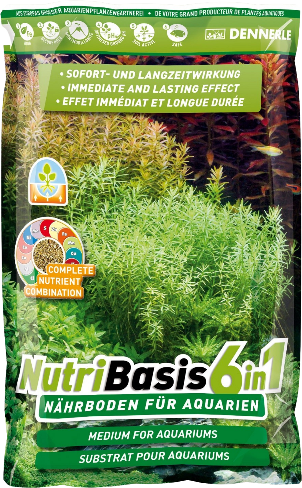 Koncentrirano hranjivo željezo u obliku depoa osigurava bogate zelene listove, a visokokvalitetni kvarcni pijesak stvara optimalnu klimu u tlu. Odabrani glineni minerali, posebno visokokvalitetni montmorilonit, pomažu vam u regulaciji ravnoteže hranjivih tvari; tako se hranjive tvari otpuštaju po potrebi i ponovno apsorbiraju u slučaju prevelike ponude. Prirodni treset bogat huminom dodatno osigurava blago kiseli okoliš tla s optimalnom pH vrijednošću i otvara hranjive tvari na način prikladan za biljke. Svi nutrijenti i elementi u tragovima nalaze se u obliku depoa s trenutnim i dugotrajnim učinkom. Nutribasis 6in1 zajamčeno je siguran za sve vaše biljke, ribe, kozice, rakove, puževe i druge stanovnike akvarija.
