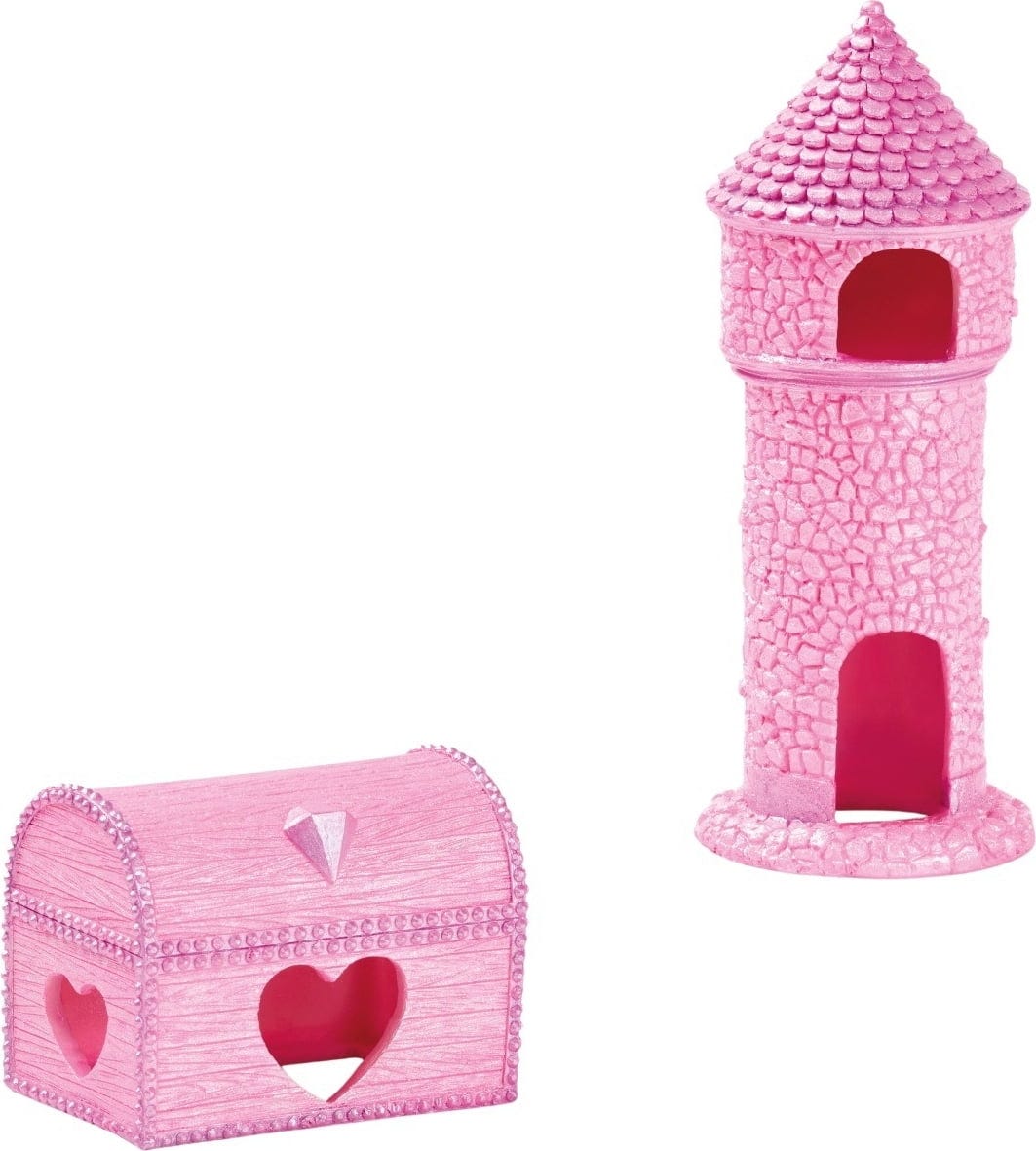 Set za princeze tvrtke Eden sastoji se od tornja i škrinje s blagom. Dizajnirani u svjetlucavoj ružičastoj boji, ova dva dekorativna elementa sigurno će privući sve poglede i postati pravi vizualni vrhunac u vašem slatkovodnom akvariju! Integrirani prozori i otvori pružaju ribama, račićima i slično mogućnost da uđu, tako da toranj i škrinja nude odličnu priliku za skrivanje i igru!