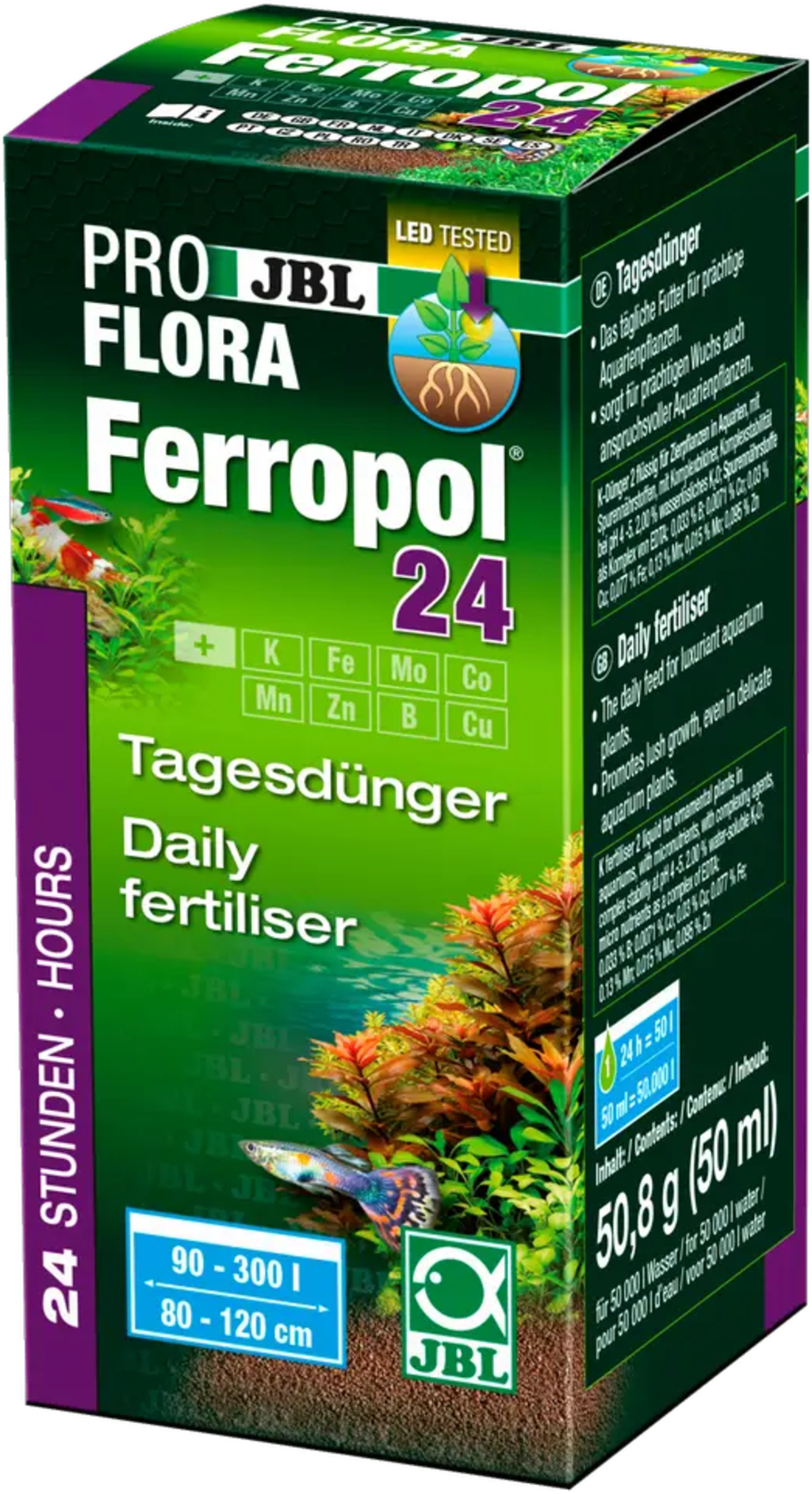 JBL Ferropol 24 opskrbljuje biljke željezom, kalijem, sumporom i stabilnim elementima u tragovima manganom, molibdenom, cinkom, borom, kobaltom i bakrom u obliku koji je biljkama potpuno dostupan. Gnojivo sprječava i ispravlja simptome nedostatka, kao što su nedostatak željeza i kalija. Optimalnim poticanjem rasta biljaka povećava se rast algi. JBL Ferropol 24 ne sadrži ni fosfate ni nitrate. Mnogi vitalni elementi u tragovima ne mogu se oploditi "na zalihi" jer su vrlo osjetljivi i drugi spojevi bi se vrlo brzo stvorili i propali u okolišu akvarija. Zbog toga više nisu dostupni biljkama. Međutim, budući da biljke mogu razviti svoj puni sjaj samo ako im ne nedostaje vitalnih nutrijenata, JBL je razvio posebno gnojivo koje sadrži sve osjetljive elemente u tragovima i druge važne tvari u prilagođenom obliku. Svakodnevno dodavanje ovih tvari omogućuje razvoj svih akvarijskih biljaka i predstavlja savršenu njegu biljaka u najboljem izdanju. Zajedno s osnovnim gnojivima JBL Ferropol i JBL AquaBasis plus, sve su akvarijske biljke optimalno opskrbljene mineralnim hranjivim tvarima i elementima u tragovima. Osim toga, preporuča se opskrba CO2.