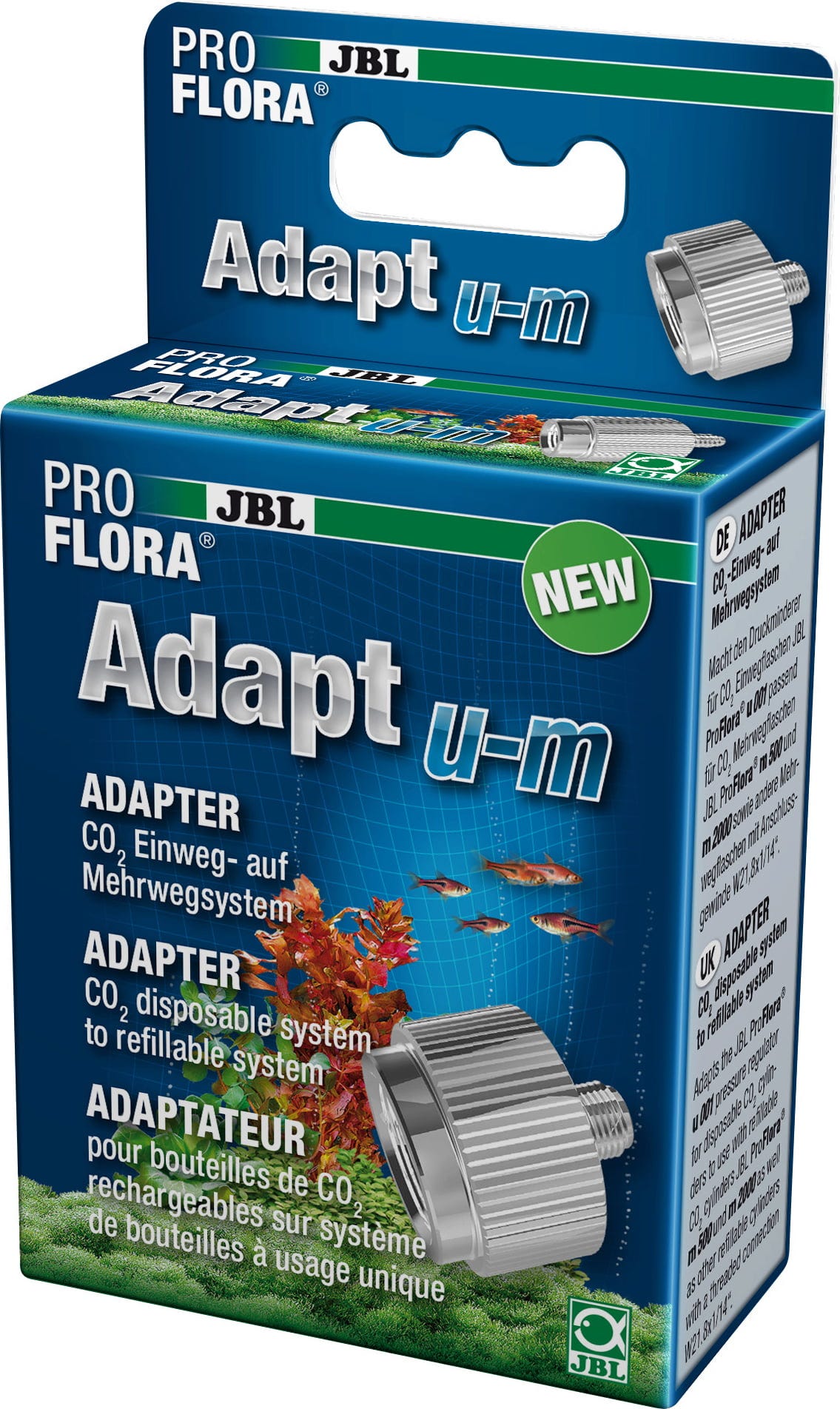 Prenamjena pomoću JBL ProFlora Adapt u-m izrazito je jednostavna: adapter jednostavno uvrnite pomoću inbus ključa veličine 6 (nije sadržan u opsegu isporuke) u priključni navoj armature za regulaciju tlaka. Sada prisutna natična matica pristaje na sve višekratne boce za pohranu. Prenamjena se u bilo kojem trenutku može poništiti. JBL ProFlora Adapt u-m prikladan je za JBL ProFlora u001 profesionalnu armaturu za regulaciju tlaka.
