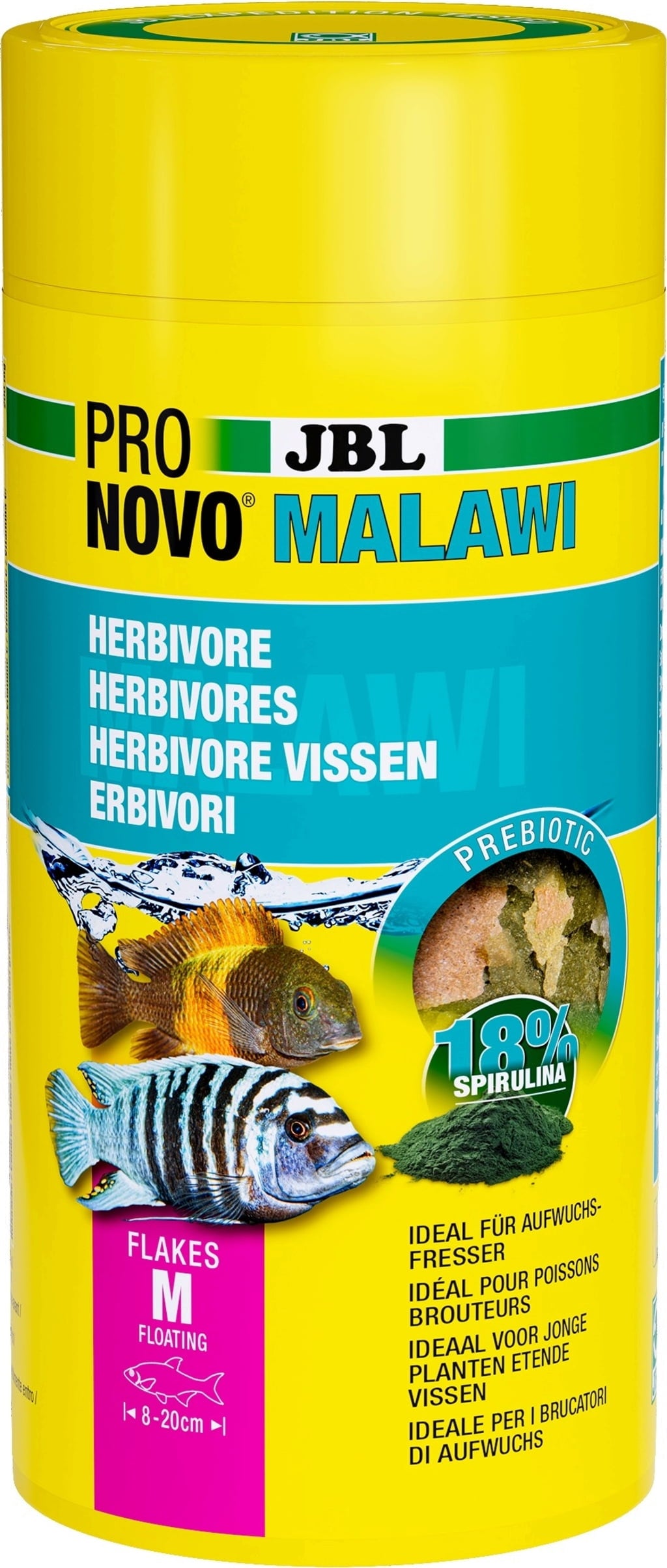 JBL PRONOVO MALAWI je potpuna hrana u obliku ljuskica za mlade ribe koje se hrane algama, npr. ciklide iz Malavija i jezera Tanganyika veličine tijela od 8 do 20 cm: ljuskice sadrže odabrane vrste algi - npr. 18 posto spiruline - i mikroorganizme koji žive u njima. Vrijedni sastojci jačaju imunološki sustav i potiču raskoš boja. Hrana je također posebno lako probavljiva, ima znatno manje fekalija, voda ostaje bistra i neizravno se smanjuje rast algi.