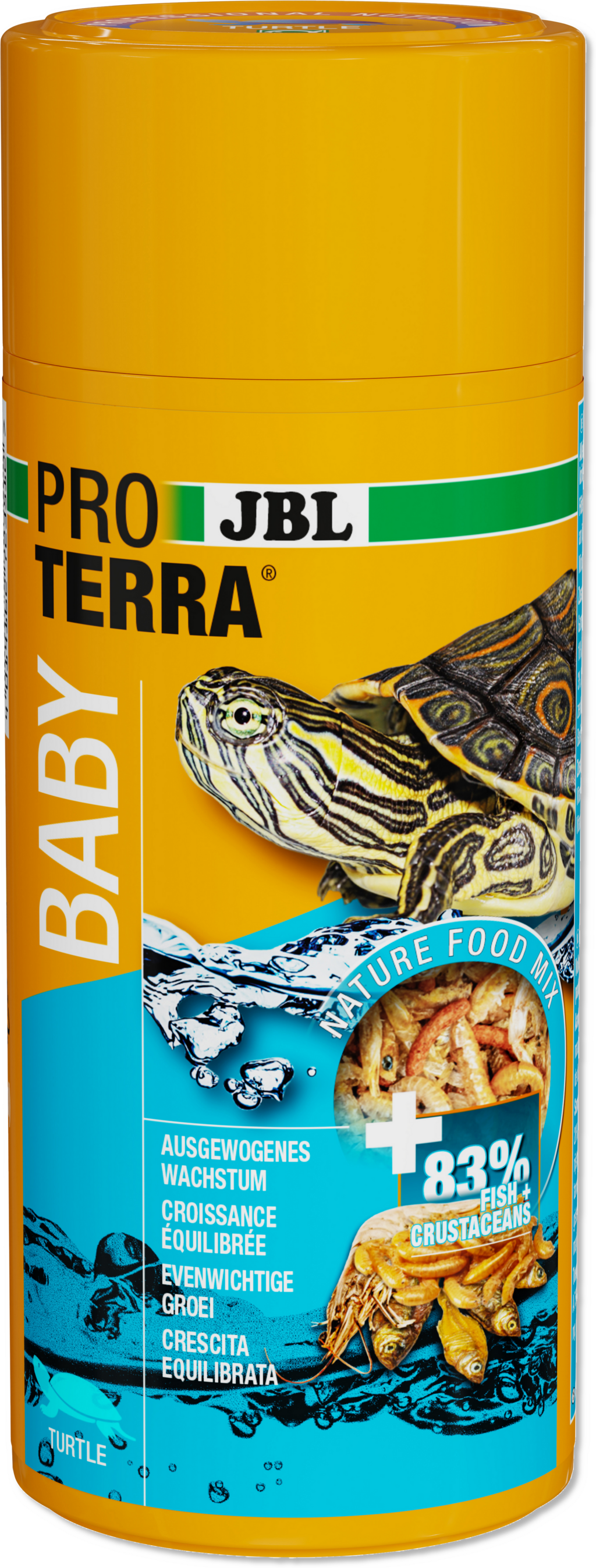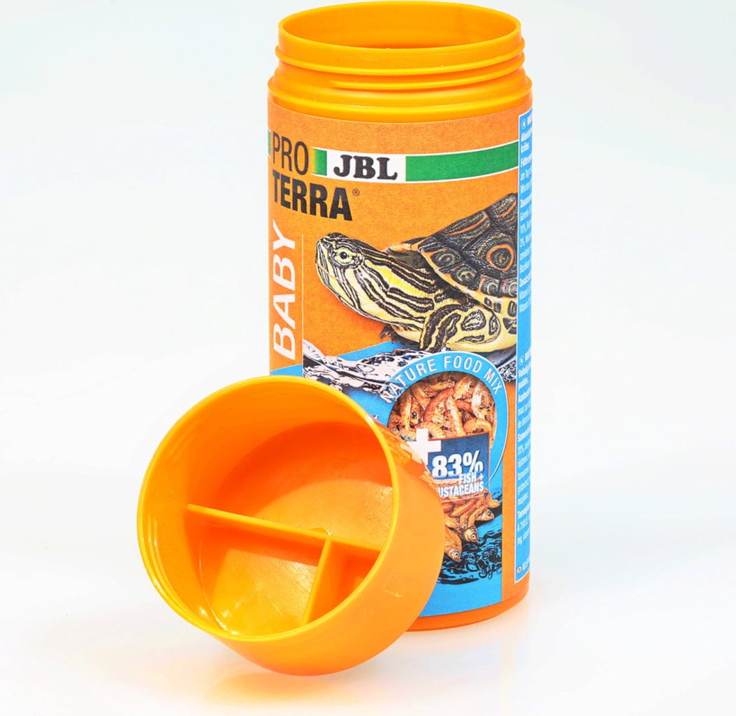 Kornjače bebe također dobivaju važne hranjive tvari od stanovnika voda. JBL je kombinirao u svojem PROTERRA BABY prosijane i očišćene račiće i kozice. Kako bi djecu na najbolji mogući način podržali u njihovom rastu, mješavina specijalne hrane zaokružena je vitaminskim ribljim štapićima.