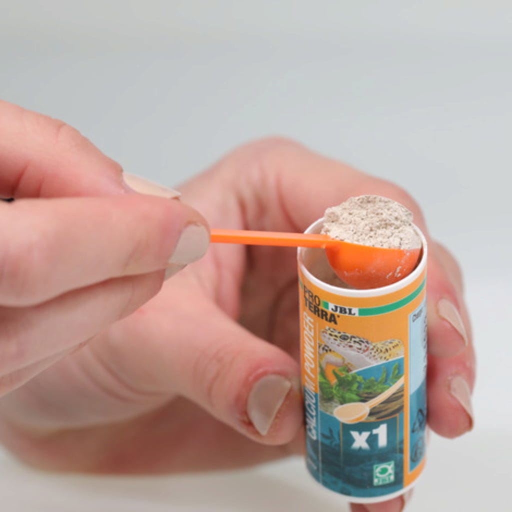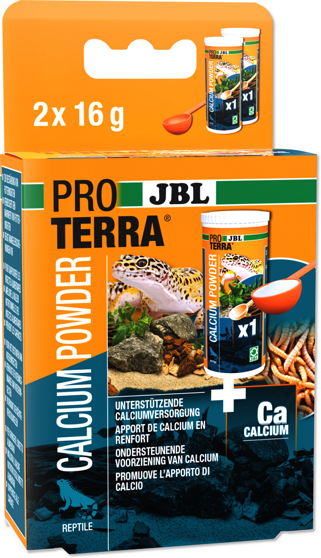 Kako biste stanovnicima terarija osigurali pravilan udio kalcija, JBL je razvio Proterra kalcij u prahu . Mineralni dodatak hrani prerađen je u fini prah i idealan je za posipanje glavne hrane. Idealan je i za oprašivanje insekata koji služe za živu hranu.