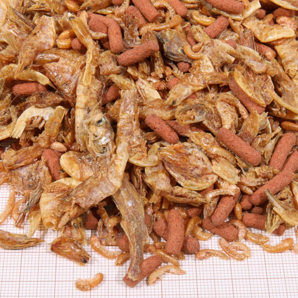 škampi, lososovo brašno, gamarus, papalina, rižino brašno, sojino brašno, brašno od kozica, pšenično brašno, brašno od pšeničnih klica, pšeničnog glutena, ekstrakt kvasca, ružmarin, timijan, bosiljak, Majoran