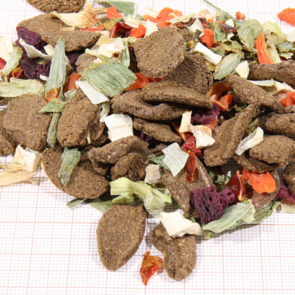 paprika, mrkve, brašno od lucerne, poručnik, brašno od pšeničnih klica, cikla, jabučna vlakna, brašno od špinata, pšenični griz, brokula, pastrnjak, sušeni rezanci cikle