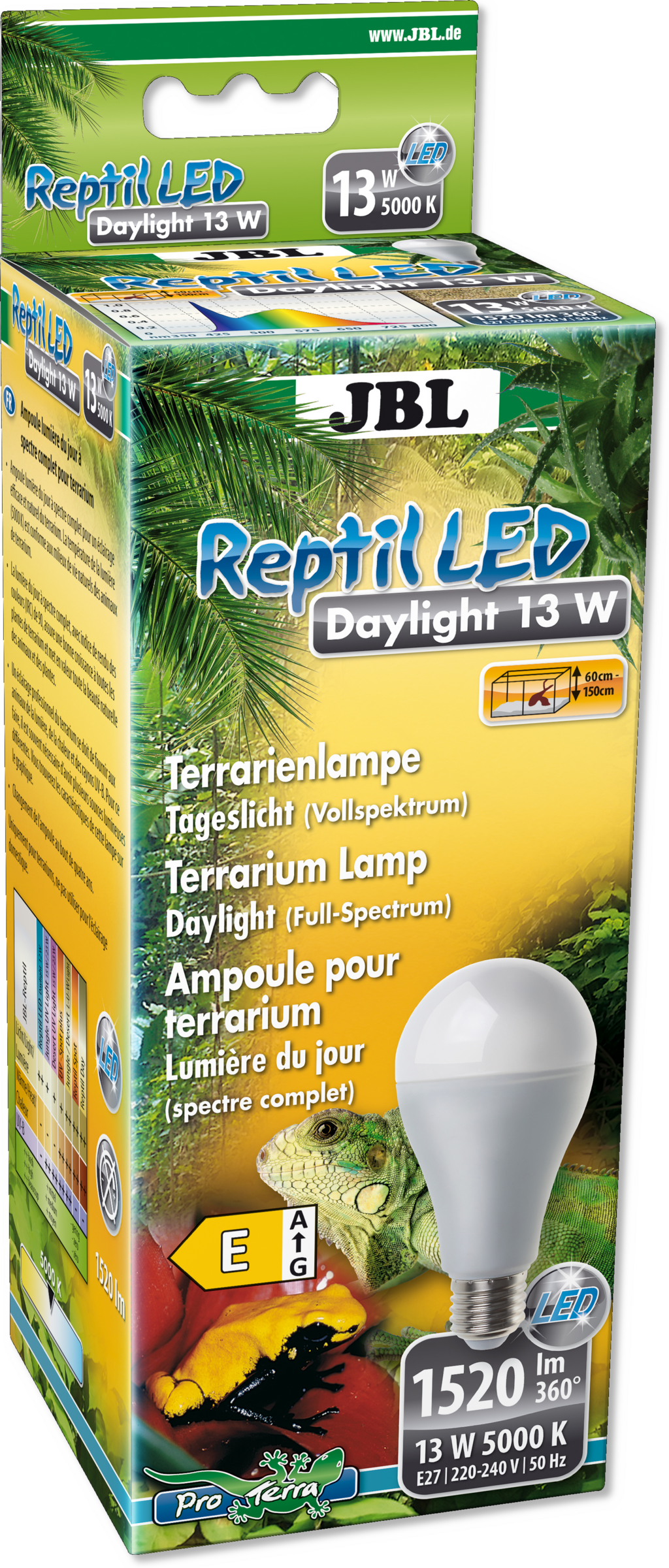 Reptil LED Daylight je energetski učinkovita LED svjetiljka za dnevno svjetlo punog spektra, koja je idealna za rasvjetu terarija. Svjetiljka od 13 W sa spektrom sličnim suncu ima visok indeks prikaza boja CRI od >90, temperaturu boje od 5000 K i PAR vrijednost od 102 µmol/m2/s. Ove vrijednosti prilagođene su prirodnim životnim uvjetima terarijskih životinja i osiguravaju idealne svjetlosne uvjete.