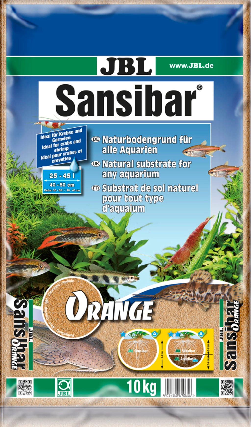 JBL Sansibar Orange obojen je prirodni supstrat sa krupnozrnatim, zaobljenim pijeskom za sve akvarije i idealan je za ribe koje kopaju dno pri ishrani, jer se taj fini zaobljeni kvarcni pijesak javlja i u njihovim prirodnim vodama. Kod hranjenja s dna kod riba kao što su raže, čikovke, somovi itd. osjetljivi brkovi su zaštićeni. Fino zrno i gusto slojevanje sprječava prodiranje mulja i drugog otpada te tako sprječava procese truljenja koji bi mogli spriječiti rast biljaka. Za veličanstven rast biljaka preporučamo JBL AquaBasic plus dugotrajni supstrat sa JBL Sansibar Orange kao gornjim slojem. JBL Sansibar Orange ne ispušta nikakve stvrdnjivače ili neželjene silikate u akvarijsku vodu.