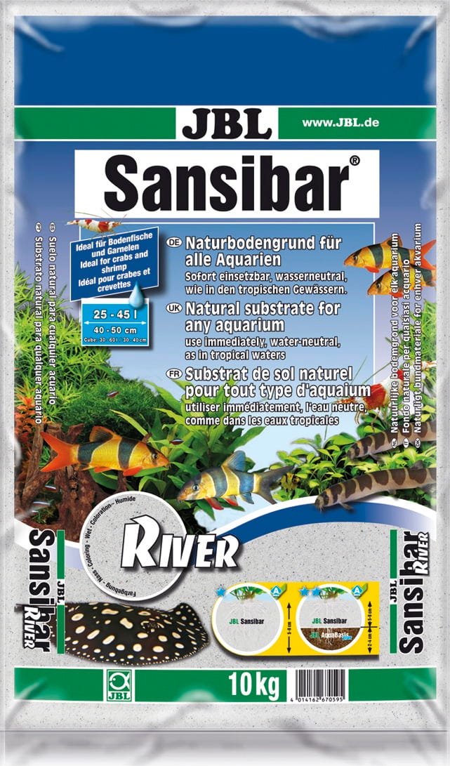 JBL Sansibar River prirodna je podloga s krupnozrnatim, zaobljenim pijeskom za sve akvarije i idealan za ribe koje se hrane s dna, jer se taj fini zaobljeni kvarcni pijesak javlja i u matičnim vodama ovih životinja. Prilikom prekopavanja dna kod riba kao što su raže, čikovke, somovi itd. osjetljivi brkovi su zaštićeni. Fino zrno i gusto slojevanje sprječava prodiranje mulja i drugog otpada te tako sprječava procese truljenja koji bi mogli spriječiti rast biljaka. Za veličanstven rast biljaka preporučamo JBL AquaBasic plus dugotrajni supstrat sa JBL Sansibar River kao gornjim slojem. JBL Sansibar River ne ispušta u akvarijsku vodu nikakve stvrdnjivače ili neželjene silikate.