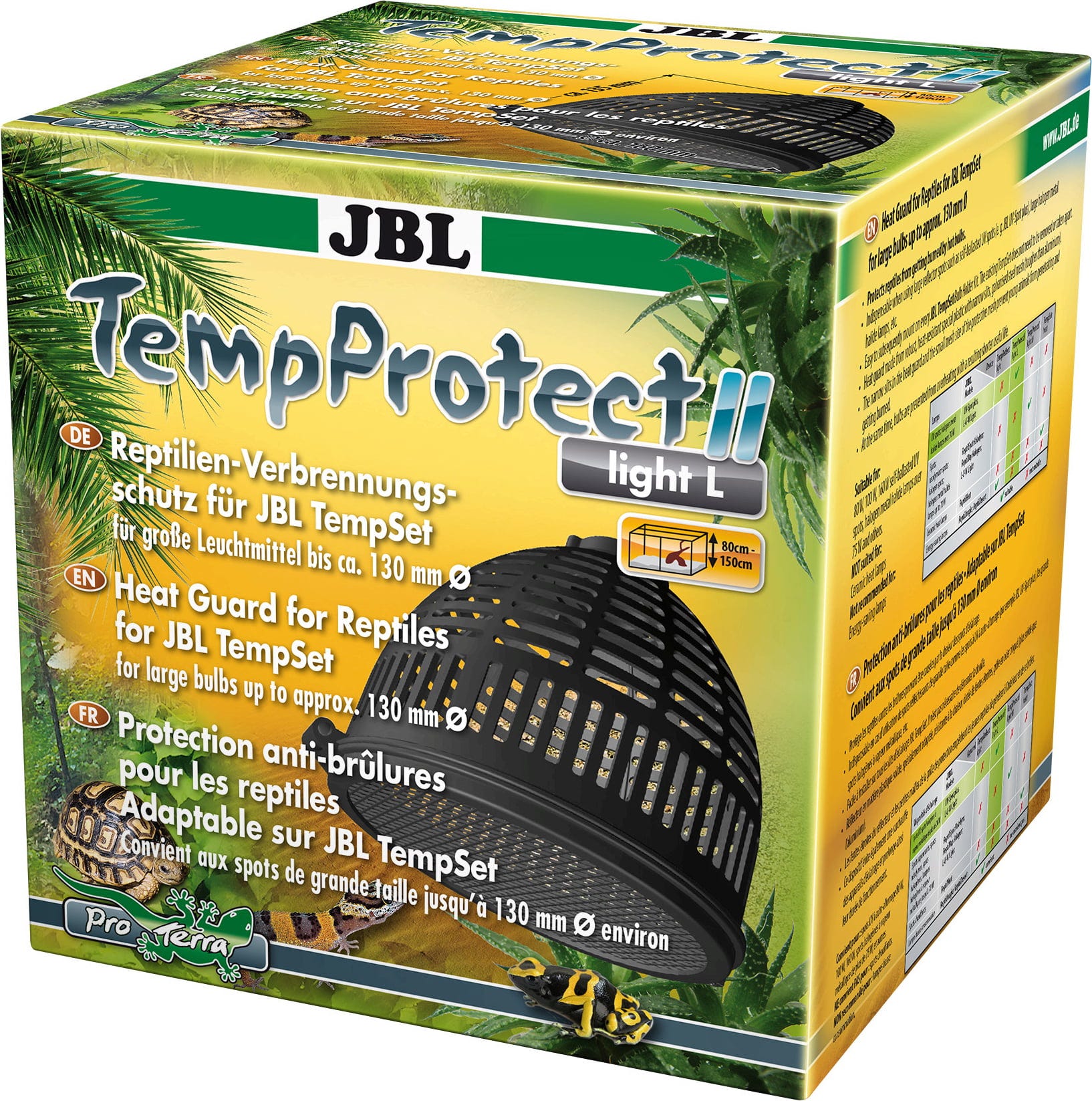 JBL TempProtect II Light je učinkovita zaštita od opeklina prikladna za JBL TempSets i sigurnosna mjera za gmazove u terarijima. Zaštitna naprava opremljena je do 290 °C toplinski otpornim abažurom od dimenzijski stabilne posebne plastike LCP (polimer tekućih kristala). Budući da se svjetiljke mogu jako zagrijati, sjenilo ima uske proreze i uske mrežaste veličine koje trajno sprječavaju prolaz i opekline na svjetlosti malih i mladih životinja. Time se također sprječava pregrijavanje žarulje!