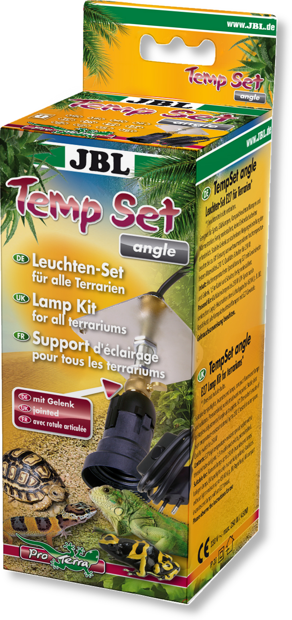TempSet angle+ iz JBL-a unaprijed je instalirani set za rasvjetne reflektore u terarijima. Instalacijski set opremljen je grlom E27 od visokokvalitetnog materijala otpornog na toplinu do 270 °C. Zahvaljujući stabilnom zglobu, svjetiljka se može nagnuti do otprilike 60° kako bi usmjerila svjetlost tamo gdje je potrebna.