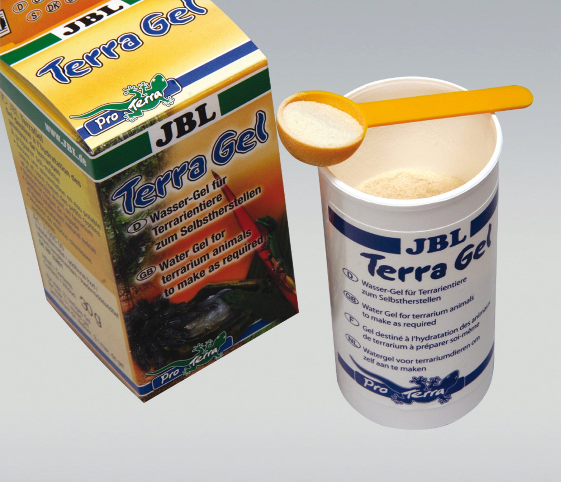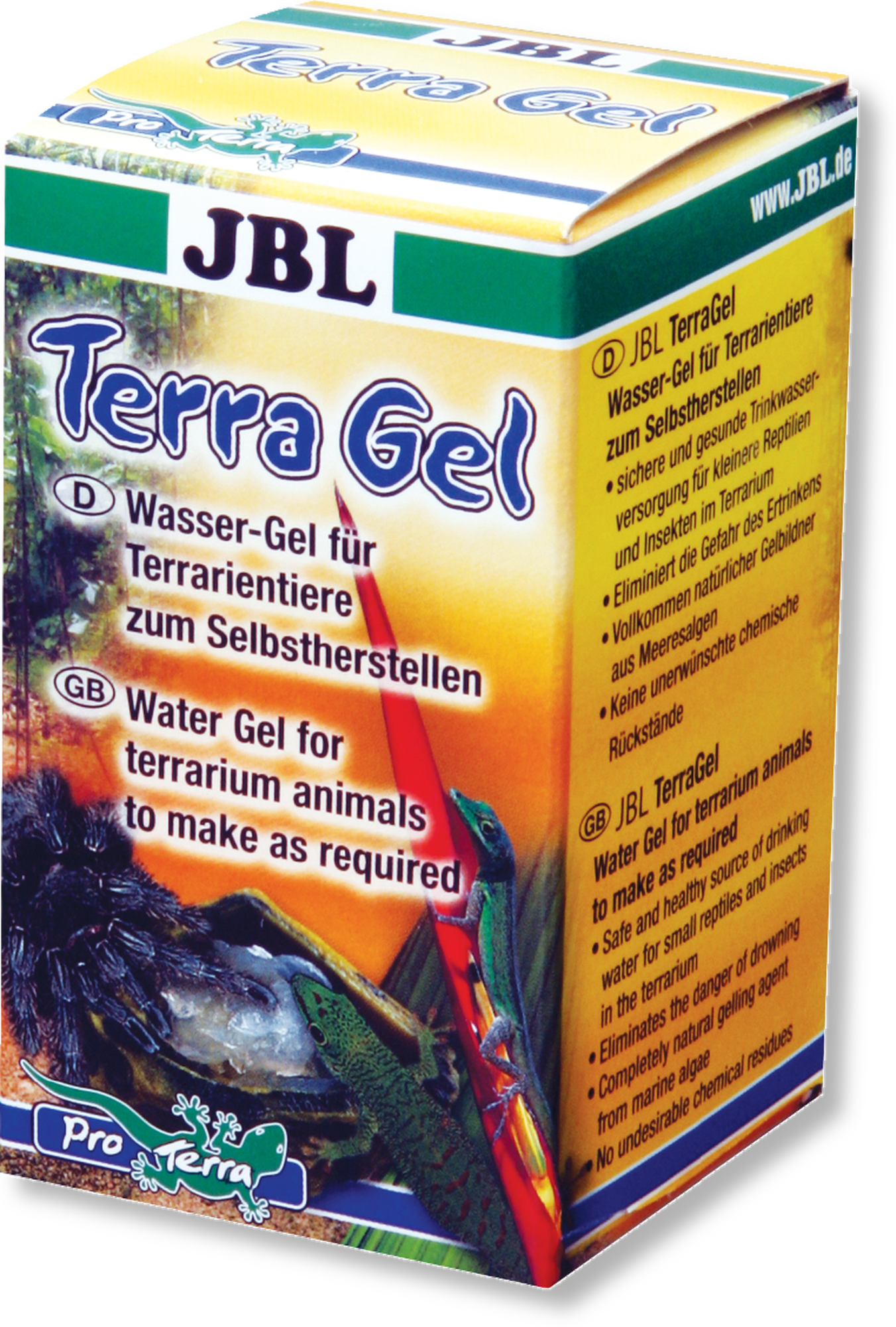 Opskrba pitkom vodom za terarijske gmazove i paučnjake nije bez problema: posebice manje vrste pokazuju povećan rizik od utapanja na pojilištima. TerraGel tvrtke JBL zahvaljujući obliku gela u potpunosti uklanja ovaj izvor opasnosti. Receptura se sastoji od prirodnih morskih algi koje ne sadrže nikakve opasne kemijske ostatke.