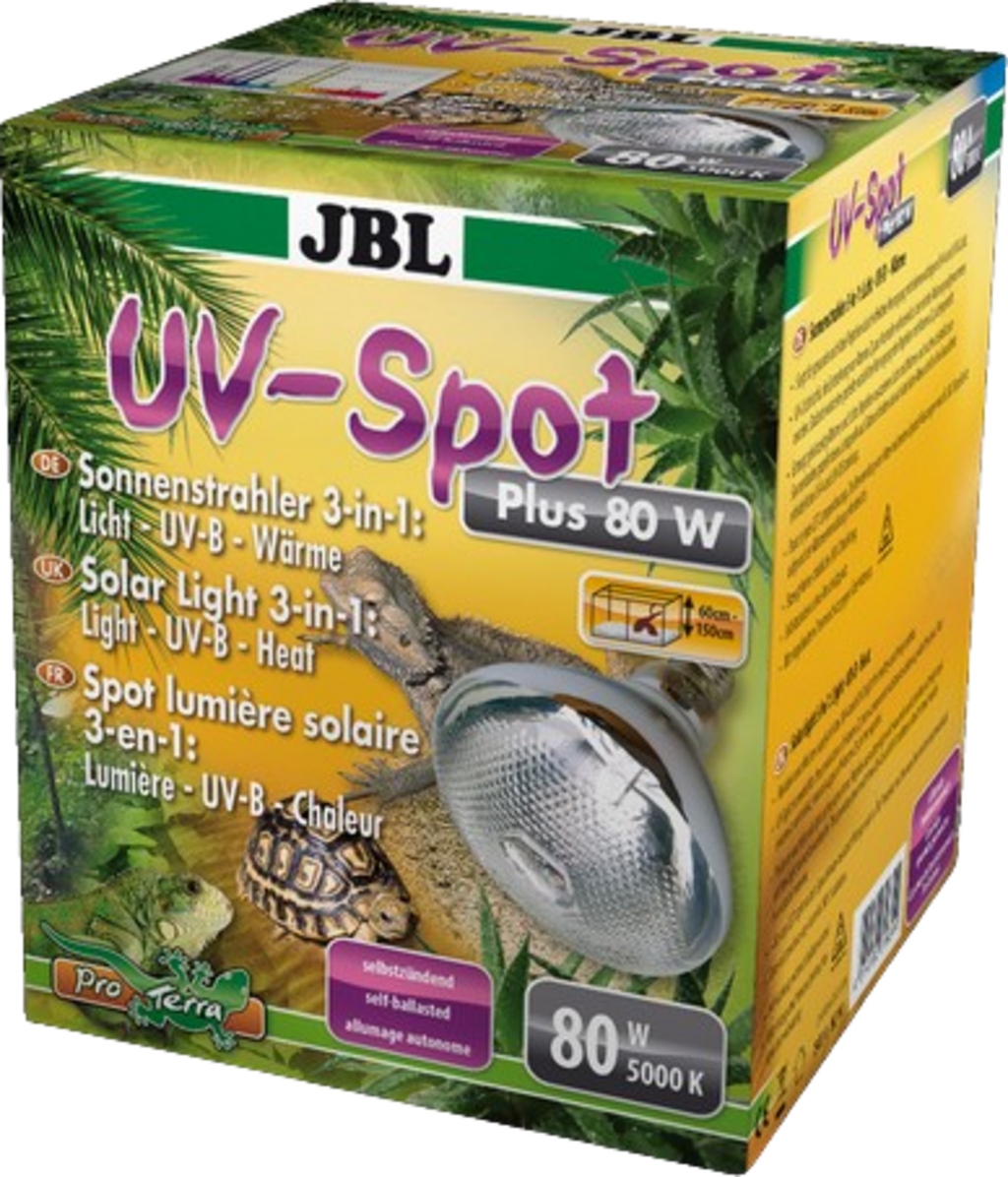 JBL UV-Spot plus je solarni UV reflektor sa spektrom dnevnog svjetla, koji terarijske životinje opskrbljuje životno važnim UV svjetlom (38 % UV-A i 7 % UV-B), toplinom i svjetlošću (5000 K). Žarulja s punim spektrom nalik suncu optimalno je prikladna za dnevno aktivne životinje jer nakon njezinog isključivanja dolazi do prirodnog noćnog pada temperature u terariju.