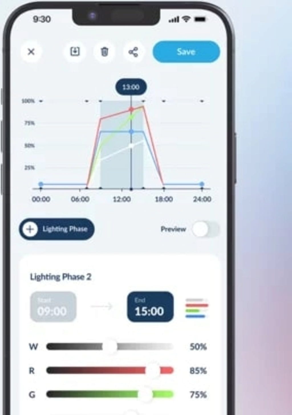 Pomoću HeliaLux AppControla možete fino prilagoditi boje svjetla kako bi savršeno odgovarale potrebama vaših riba i biljaka. Zahvaljujući potpunoj WRGB kontroli, svaka se boja može individualno podešavati.