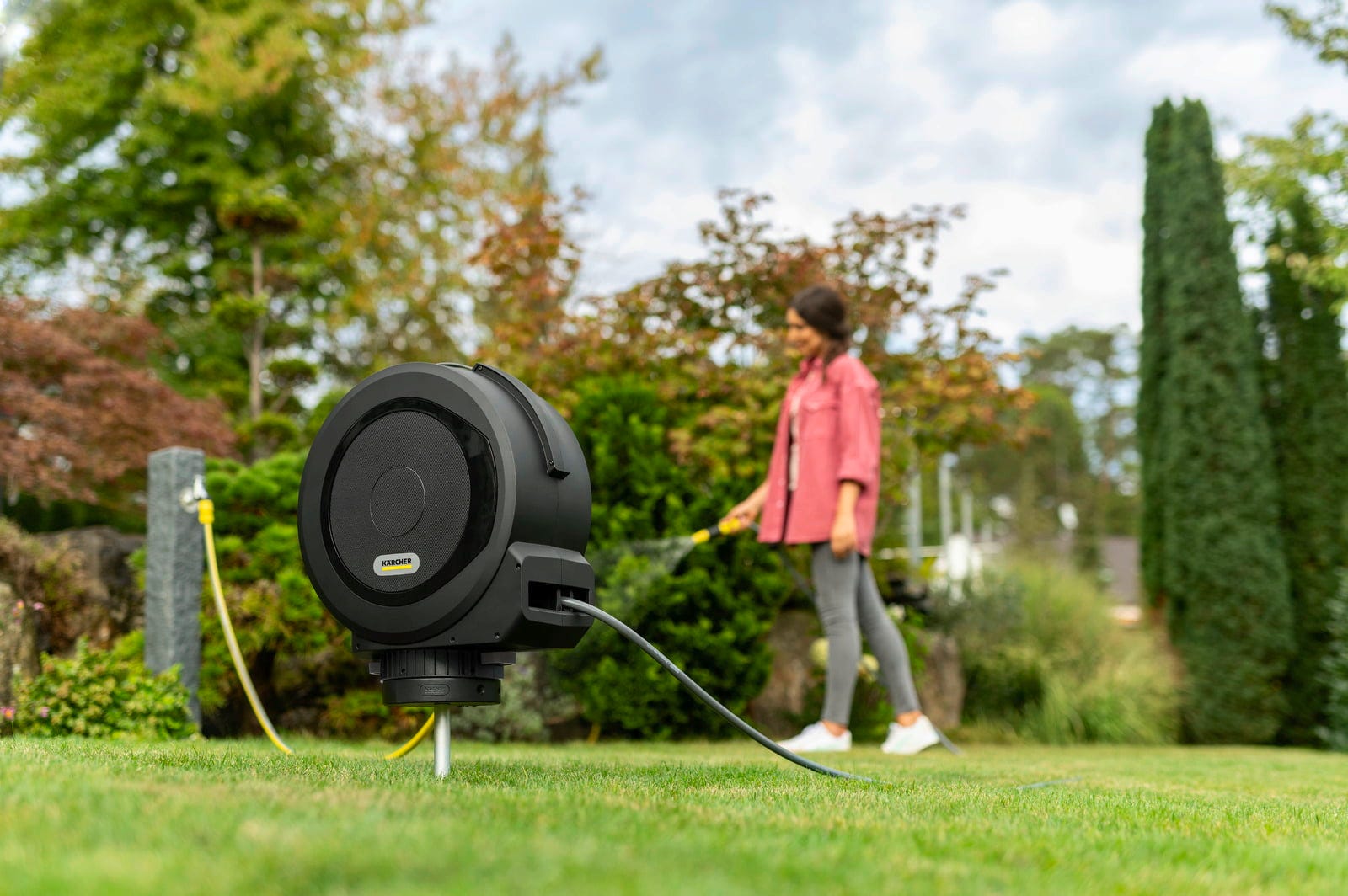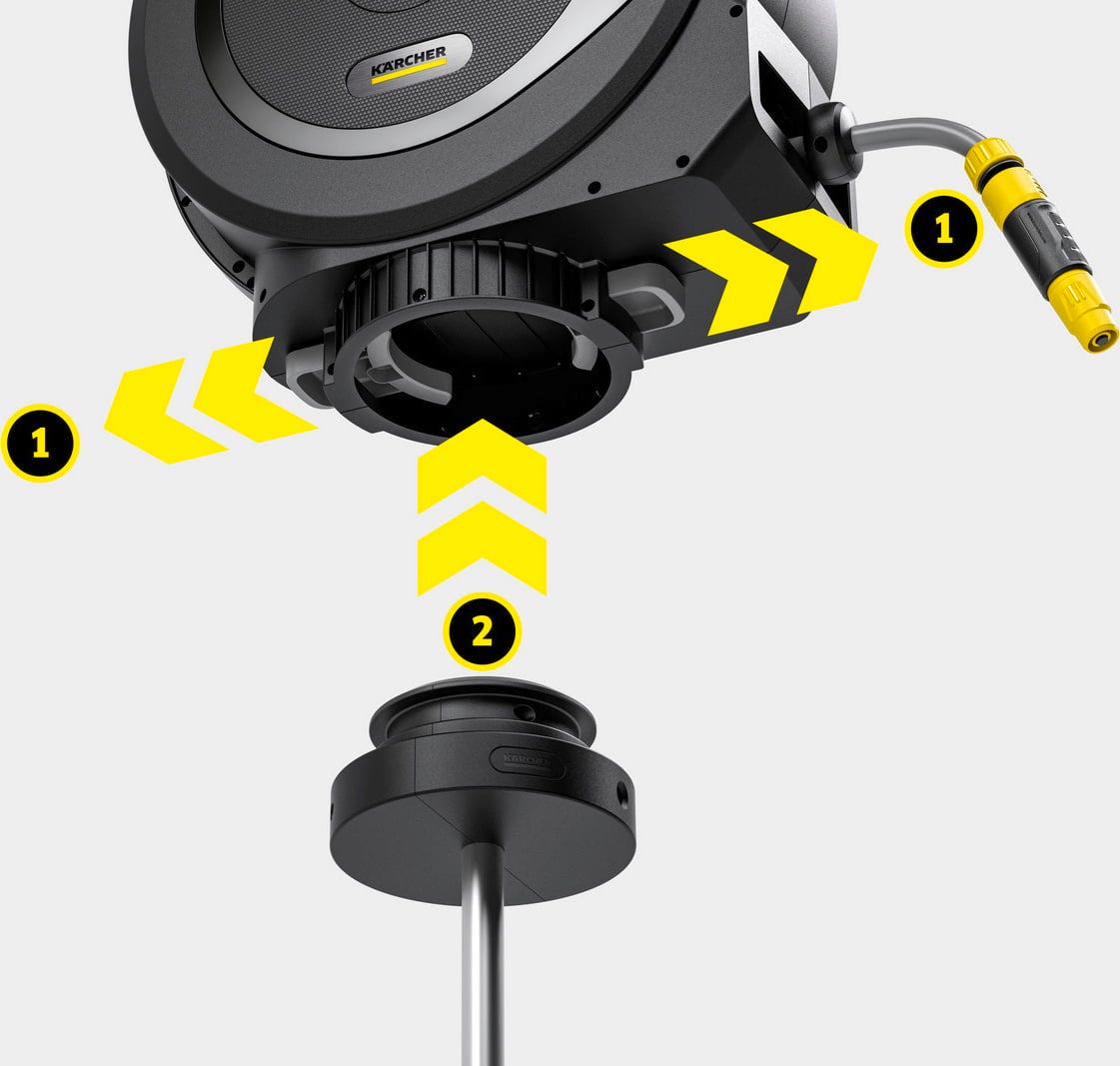 U kombinaciji s Kärcher kutijom za crijevo omogućava posebno fleksibilan sustav crijeva u vrtu. Montirana kutija može se okretati za 360°, što omogućava slobodno kretanje crijeva prilikom navodnjavanja. To smanjuje pregibanje crijeva i olakšava korištenje bubnja za crijevo za vrtnu vodu oko gredica, travnjaka ili područja s biljkama. Zahvaljujući FlexChange tehnologiji, kutija za crijevo može se postaviti na šiljak bez alata ili ukloniti. Tako se bubanj za crijevo vrt može koristiti točno tamo gdje je potrebno.