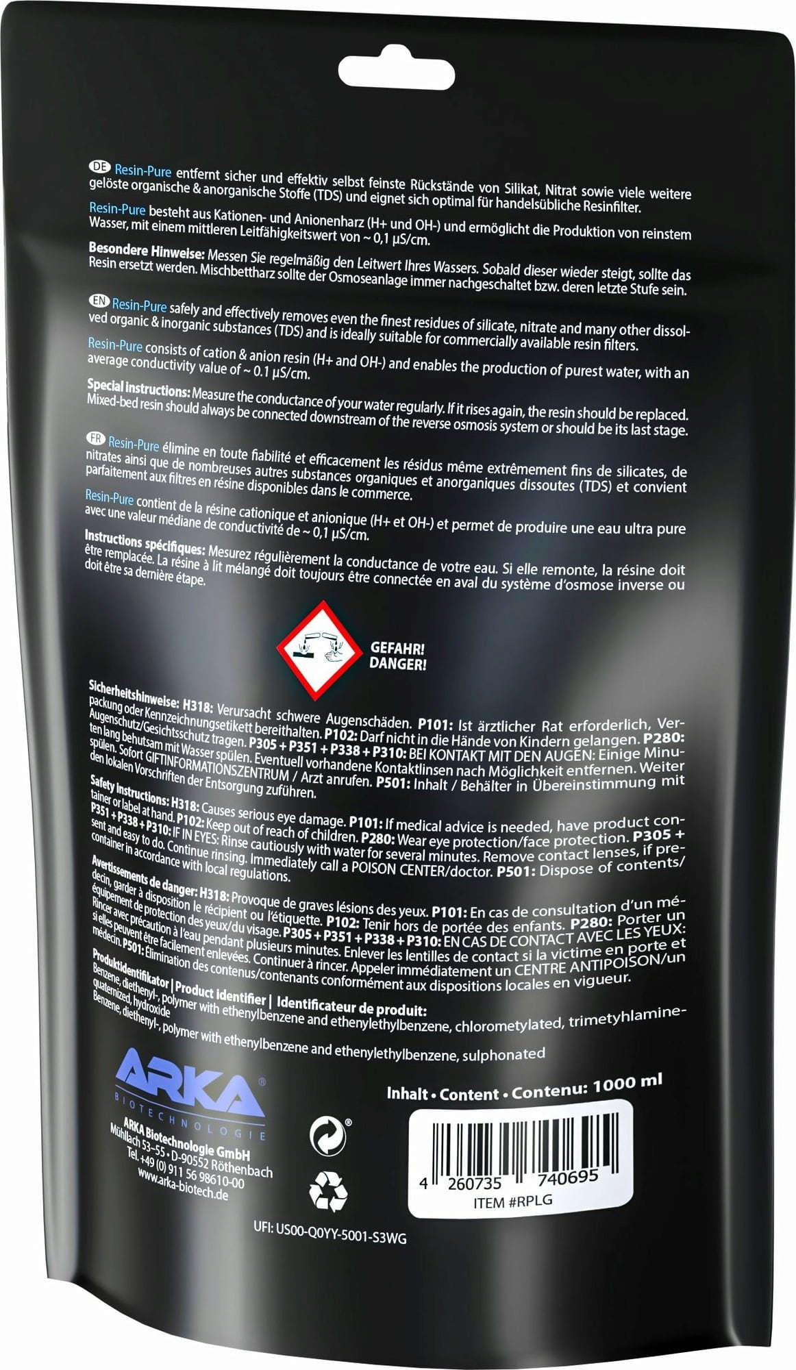 Desalinizacija Resin-Pure je mješavina kationskih i anionskih smola (H+ i OH-), idealna za komercijalne filtere od smole. Resin-Pure trajno uklanja ne samo najfinije ostatke silikata i nitrata, već i druge otopljene organske i anorganske tvari. Smjesa tako osigurava najčišću vodu, koja ima prosječnu vodljivost od približno 0,1 μS/cm.
