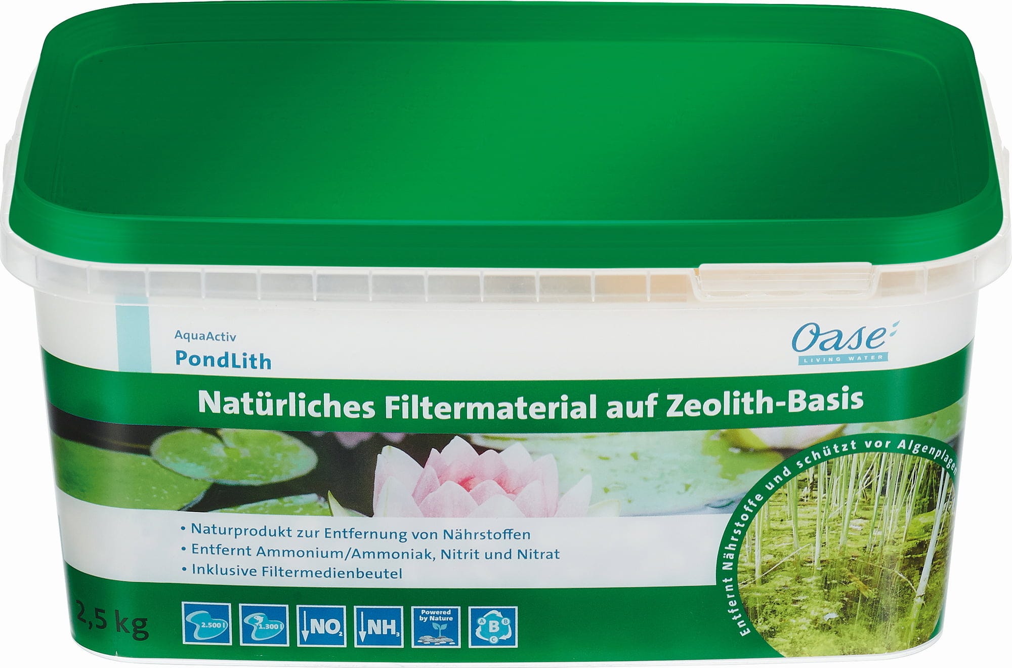 Oase AquaActiv PondLith je filtarski materijal na bazi potpuno prirodnog zeolita granulacije 5-10 mm. Posebno je snažan za razgradnju dušičnih spojeva. Osim toga, pokazao se kao brza pomoć kod viška amonija.