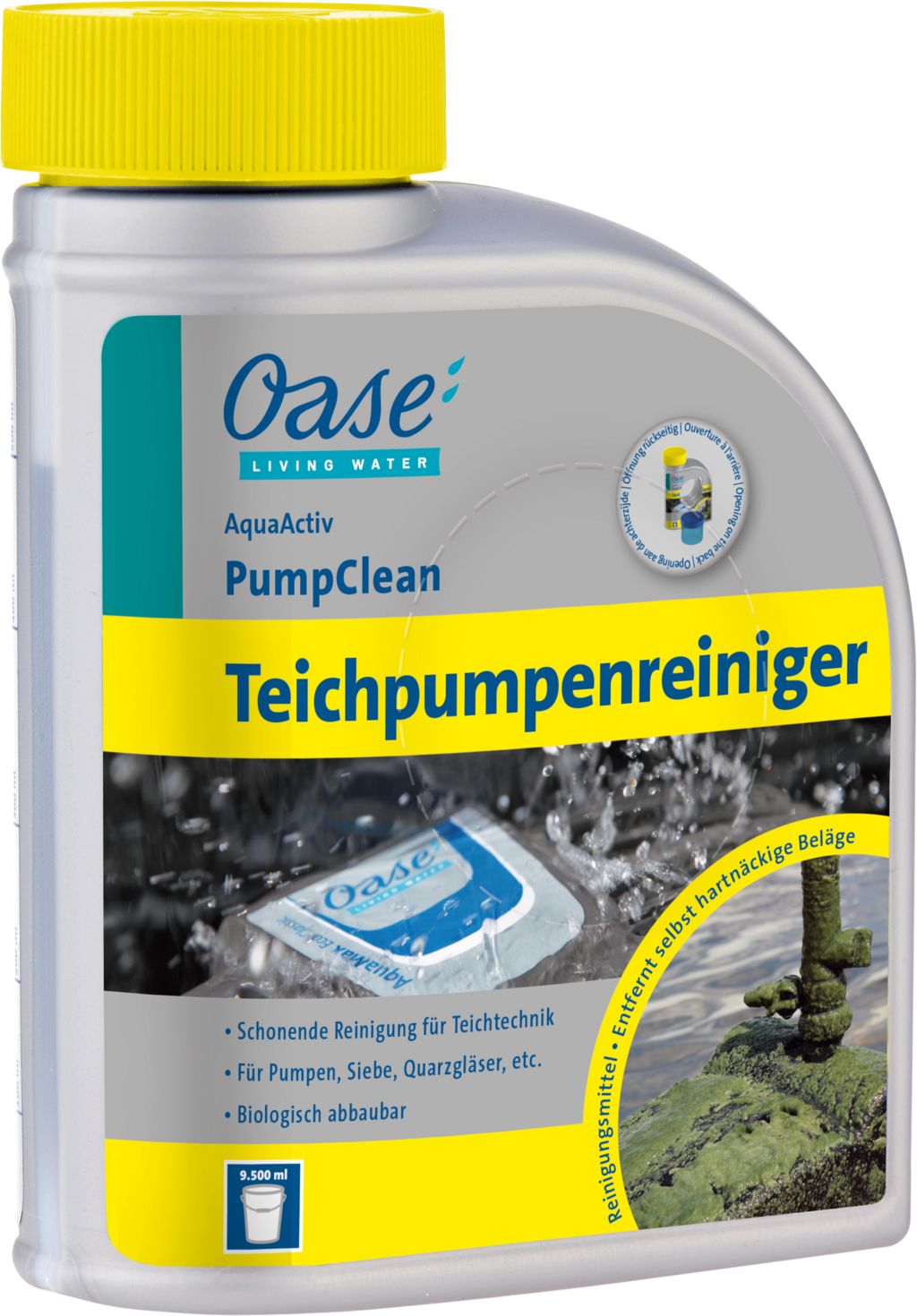 Oase AquaActiv sredstvo za čišćenje pumpi za ribnjake učinkovito je sredstvo za čišćenje opreme ribnjaka, kao što su pumpe, sita, kvarcna stakla itd. Unutar 24 sata pouzdano uklanja kamenac i druge naslage te tako produžuje vijek trajanja pumpi za ribnjake.