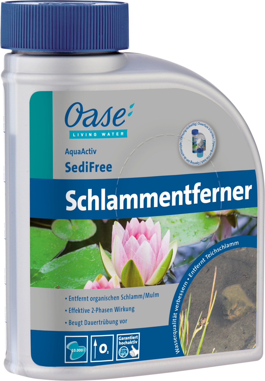 Ukloniti postojeće zamuljivanje i spriječiti novo zamuljivanje – AquaActiv SediFree tvrtke Oase učinkovit je pomagač kod prekomjernog mulja u slabo protočnim zonama ribnjaka: granulat sadrži aktivni kisik i vrlo aktivne bakterije, takozvane visokoučinkovite bakterije. Obje komponente nakon taloženja na dno ribnjaka postaju vrlo aktivne i ubrzavaju razgradnju organskih sastojaka mulja. Vrtni ribnjak se čisti od mulja bez iskopavanja i bez zamjene vode, odnosno preventivno ostaje bez mulja, bistar i bez naslaga algi!