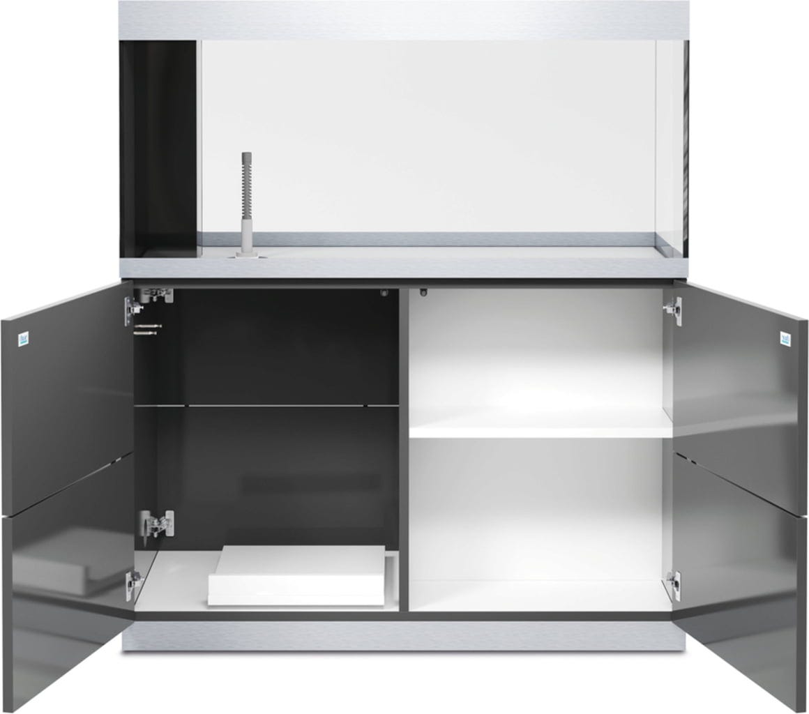 Ormarić bez stražnje stijenke dostupan je s obje strane i nudi iznenađujuće mnogo prostora za pohranu pribora i tehnike. Vrlo komforno: izvlačna polica za filtar može se prilagoditi ovisno o položaju akvarija.