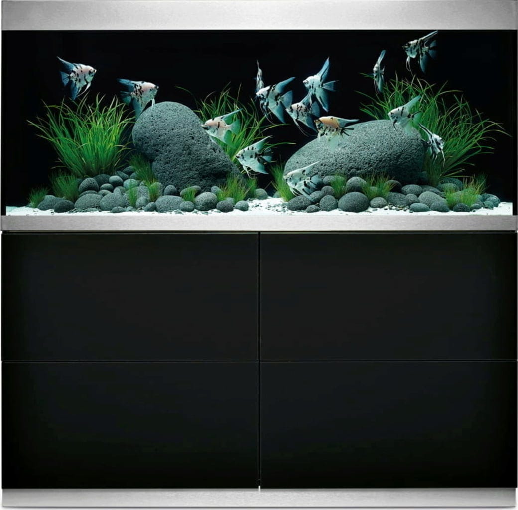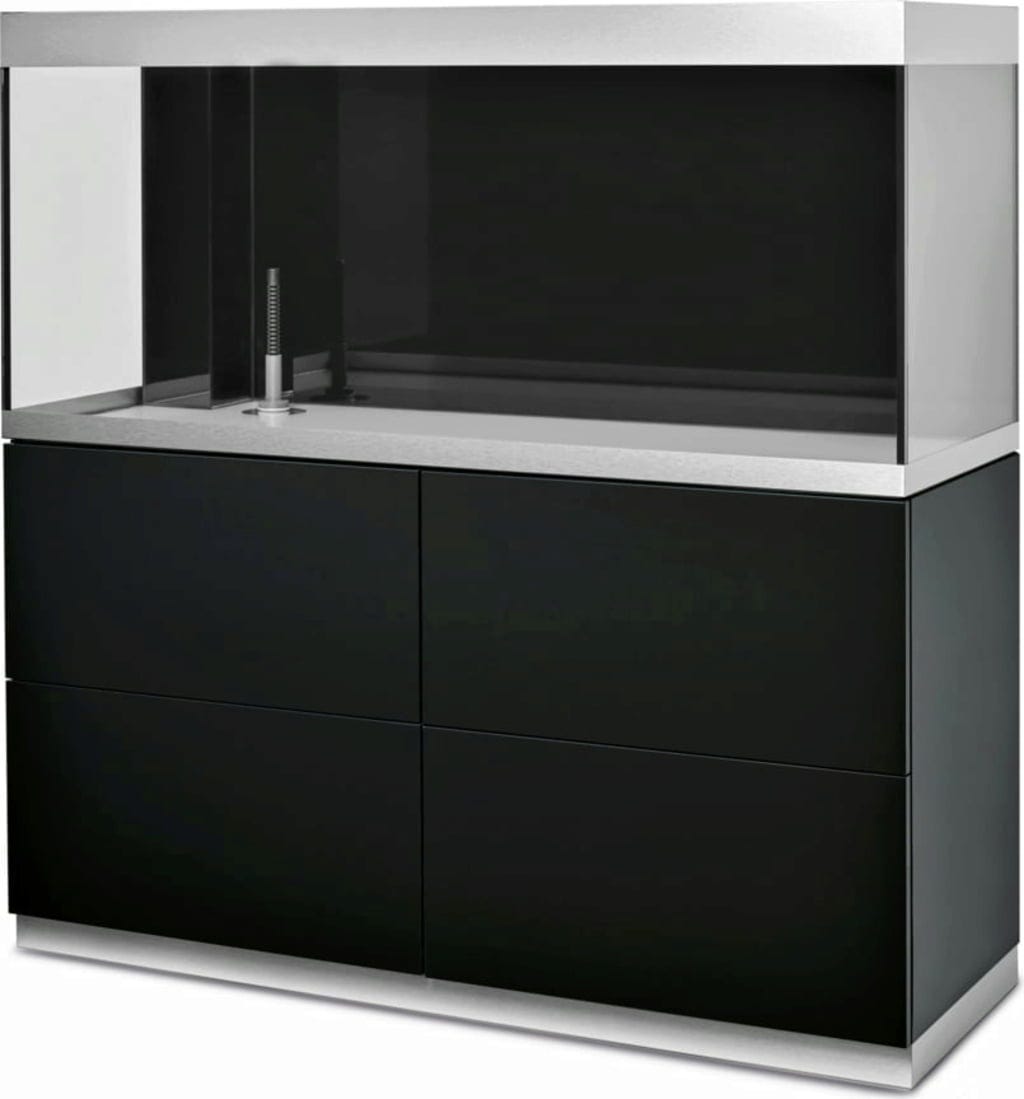 Vrata ormarića bez ručki s otvaranjem na pritisak osiguravaju jasne linije, a aluminijske maske na akvariju dodatno prekrivaju ružne rubove.
