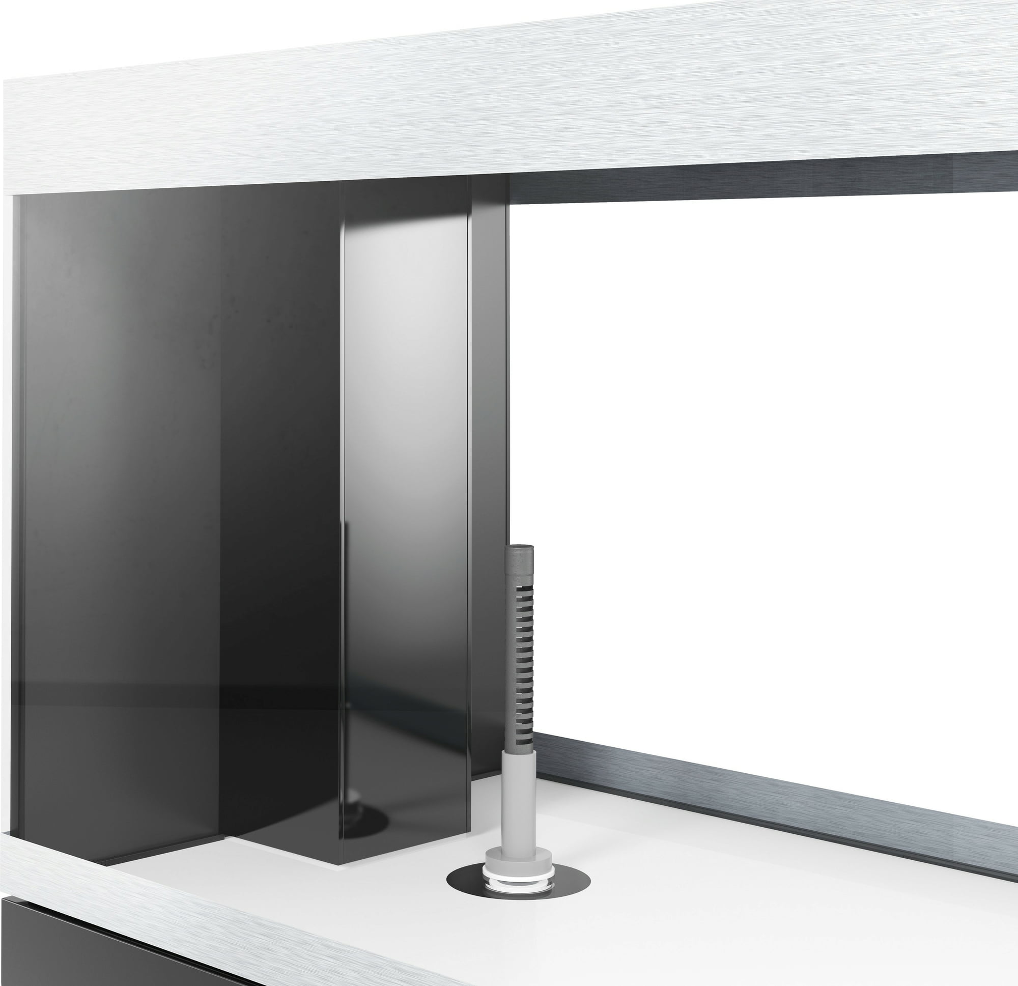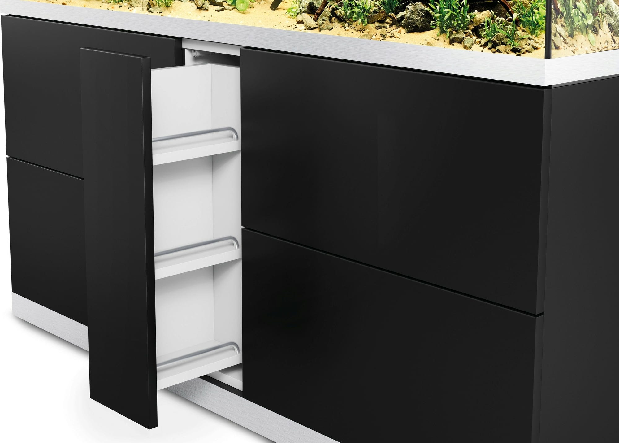 Vrata ormarića bez ručki s otvaranjem na pritisak osiguravaju jasne linije, a aluminijske maske na akvariju dodatno prekrivaju ružne rubove.
