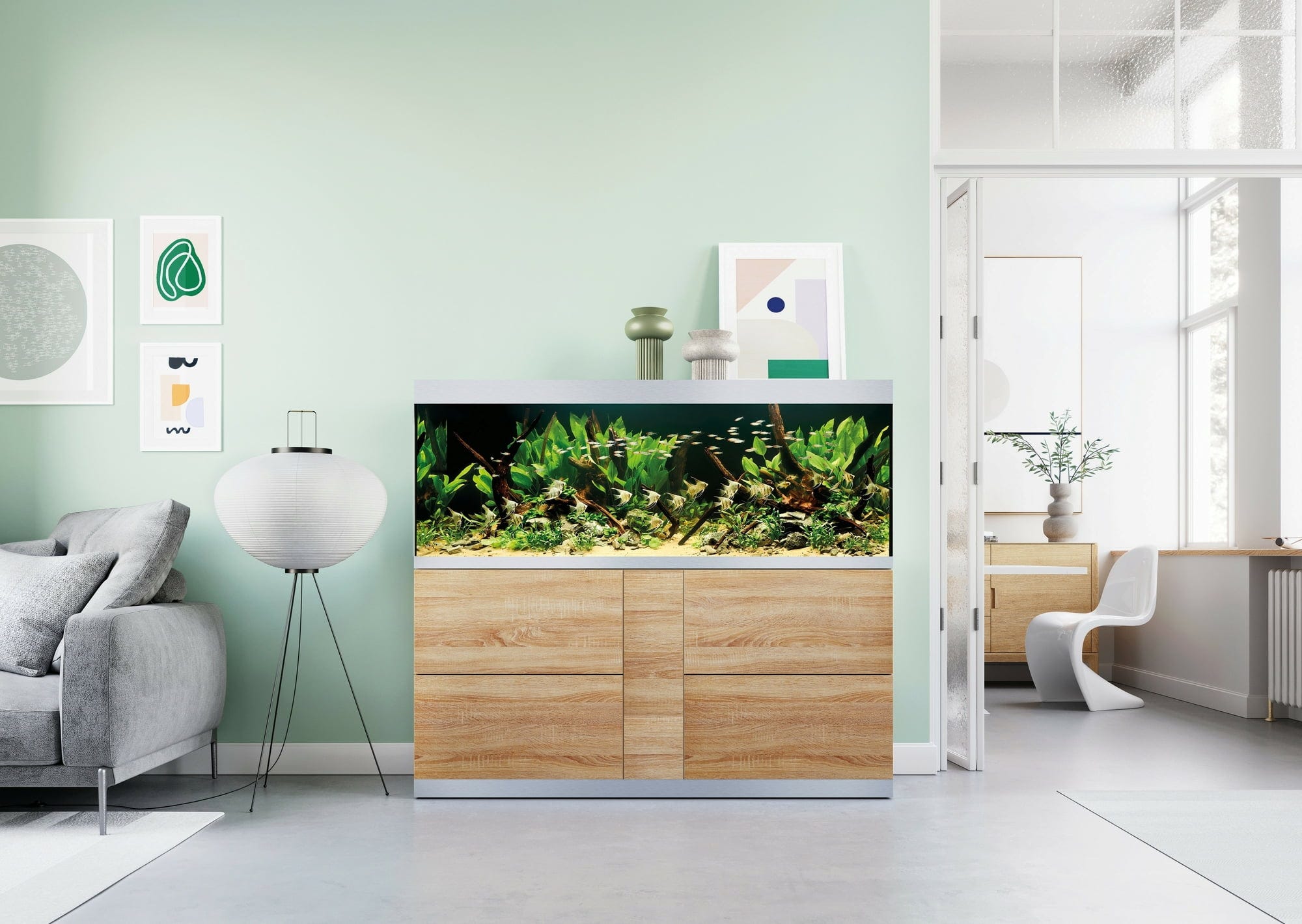 Vrata ormarića bez ručki s otvaranjem na pritisak osiguravaju jasne linije, a aluminijske maske na akvariju dodatno prekrivaju ružne rubove.