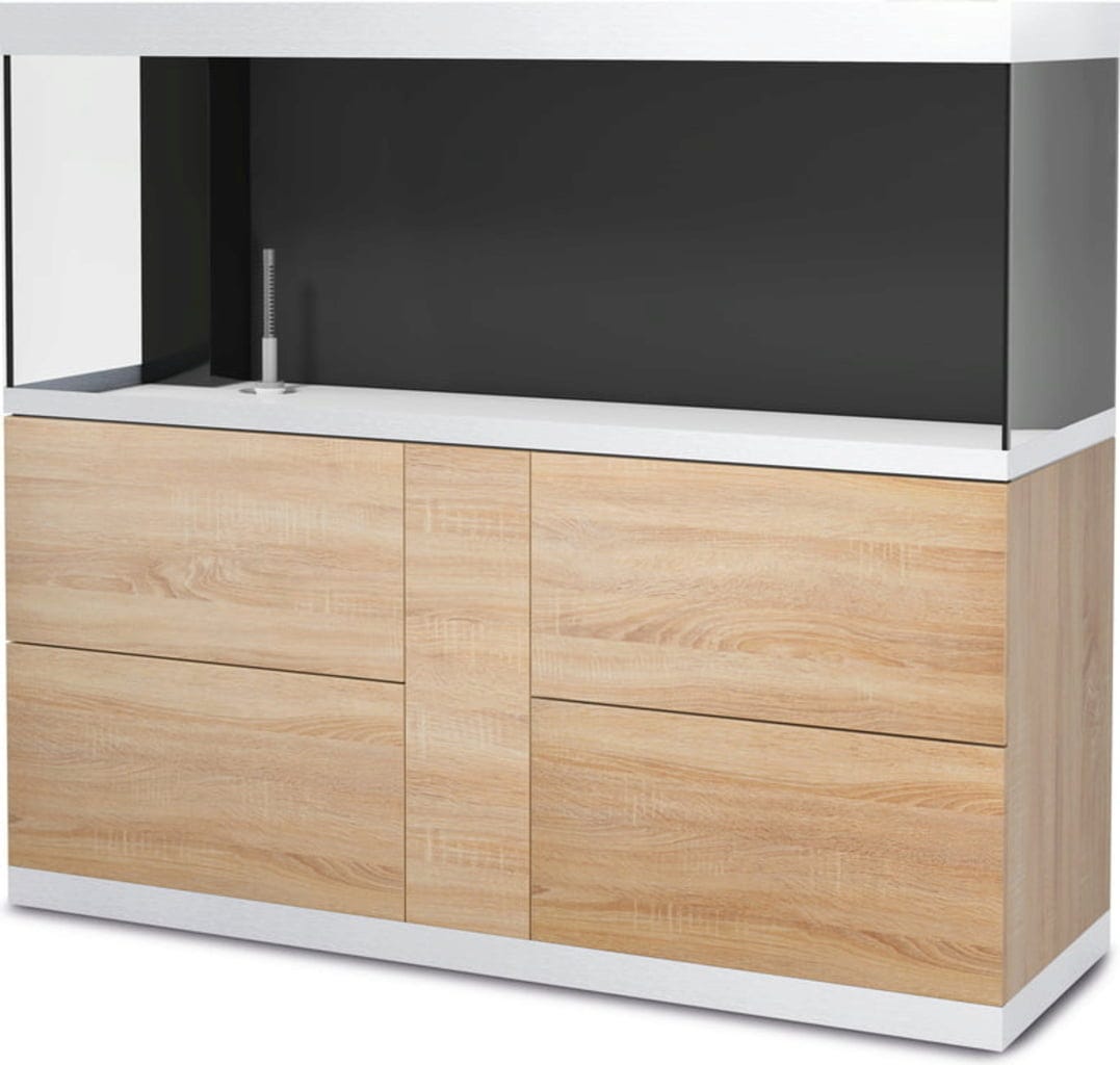 Akvarijska kombinacija Highline optiwhite 600 hrast brenda Oase naglašava novi dizajn i individualnost. Akvariji i ormarići OASE HighLine besprijekorno su usklađeni i uvjeravaju visokokvalitetnim materijalima. S tlocrtnom površinom od 160 x 60 cm i pravokutnim dizajnom optimalno se uklapa u svaki stambeni ambijent, uz vrlo praktičan dizajn: sa suhim oknom za uredno vođenje kabela i crijeva te sa specifičnim provrtom na dnu uključujući jednostavnu mogućnost priključka za filtar. Suho okno osigurava dodatne mogućnosti skrivanja pa tehnika potpuno nestaje. Ormarić je opremljen podesivim nožicama za sigurno stajanje bez klimanja.