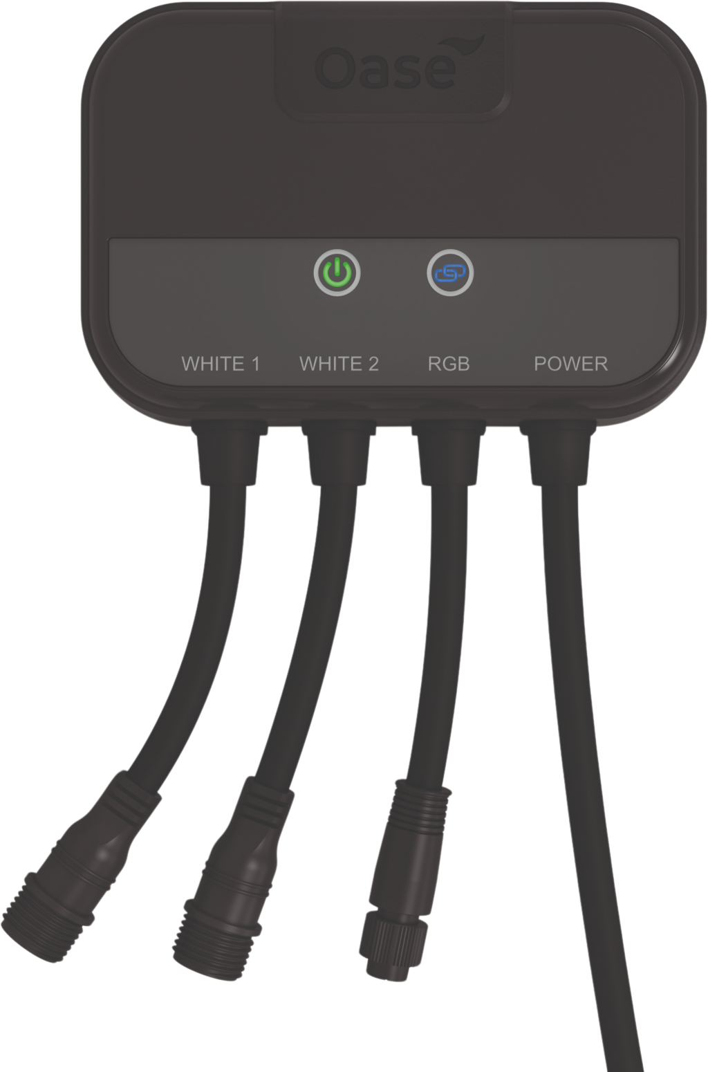 Također je uključen LunAqua Connect Controller, koji se može upariti s aplikacijom Oase Switch, tako da možete pametno upravljati svim svjetiljkama iz LunAqua Connect serije brenda Oase! On raspolaže s dva izlaza za bijele svjetiljke i jednim za RGB svjetiljke te vam tako omogućuje jednostavno upravljanje vašim izvorima svjetla. Uz to nudi funkciju prigušivanja, odabir boja te vremenski prekidač. On tvori fiksni sastavni dio u LunAqua Connect sustavu rasvjete i može se u svakom trenutku proširiti daljnjim reflektorima i sjajnim priborom.