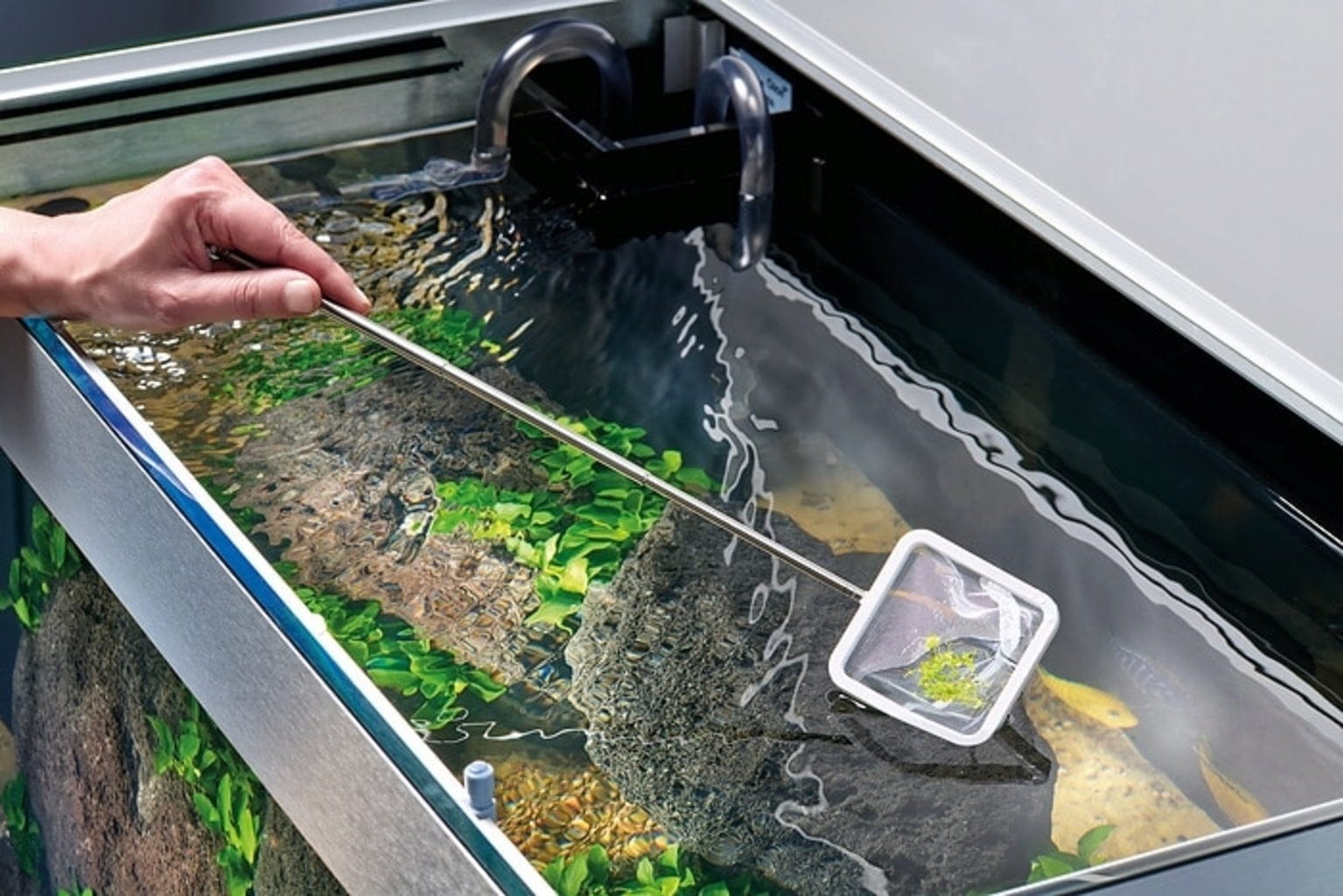 Mreža za ribe sitnih očica s izvlačnom teleskopskom palicom duljine do 42 cm. Nježna metoda za vađenje riba iz akvarija i čišćenje vode od ostataka biljaka.