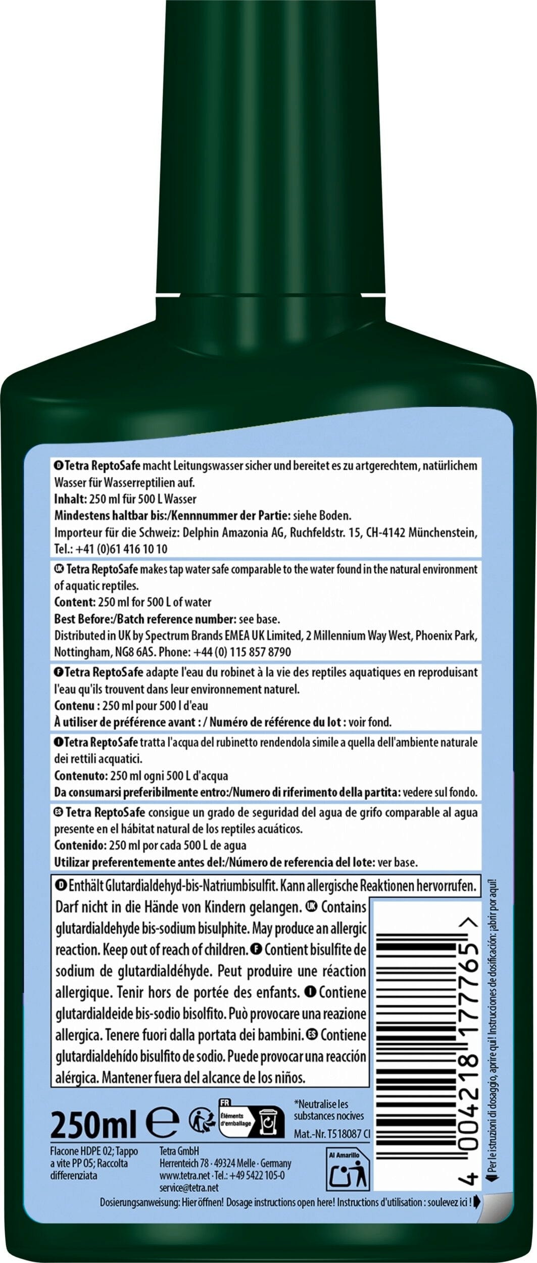 Tetra ReptoSafe sigurno pretvara vodu iz slavine u prirodnu vodu za vodene gmazove prikladnu vrsti. Zagađivači poput klora, kloramina i teških metala poput bakra ili cinka neutraliziraju se iz vode iz slavine. Vitamini i vitalne tvari koje sadrži potiču zdravlje gmazova i također štite njihovu osjetljivu kožu.