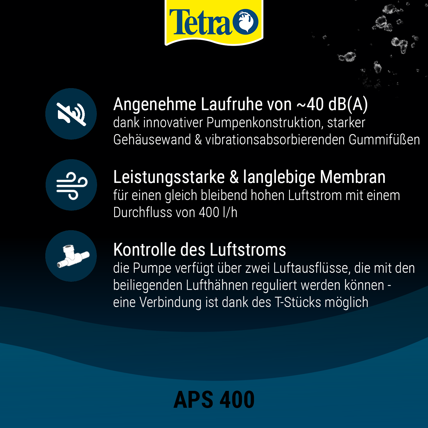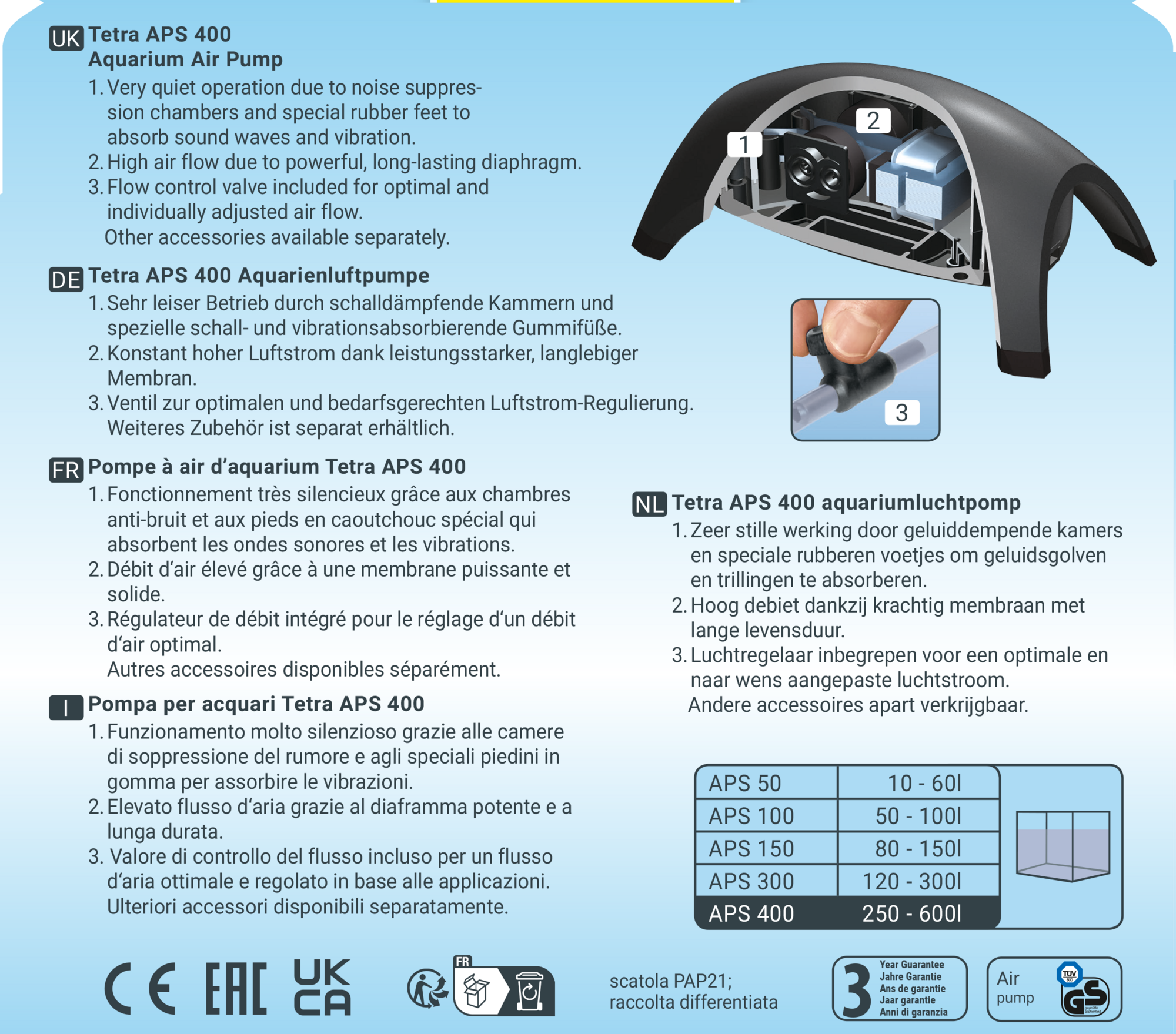 Zračna pumpa za akvarij neophodna je za rad spužvastih filtara na zračni pogon ili za povećanje sadržaja kisika kroz povećano kretanje površine. Tetra APS akvarijska zračna pumpa je vrlo tiha i iznimno snažna zračna pumpa koja zahvaljujući komorama za upijanje zvuka radi vrlo tiho. Zahvaljujući inovativnom dizajnu pumpe s jakim stijenkama kućišta i posebnim gumenim nogama koje apsorbiraju vibracije, moguć je vrlo tih rad. Tetra APS zračna pumpa impresionira iznimnom kvalitetom i pouzdanošću te nudi konstantno visok protok zraka kroz izdržljivu i jaku dijafragmu. U pakiranju je uključena zračna slavina za kontrolu protoka zraka. Rad je izuzetno jednostavan. Zračna pumpa za akvarij Tetra APS testirana je TÜV/GS i ima CE certifikat te 3 godine jamstva.